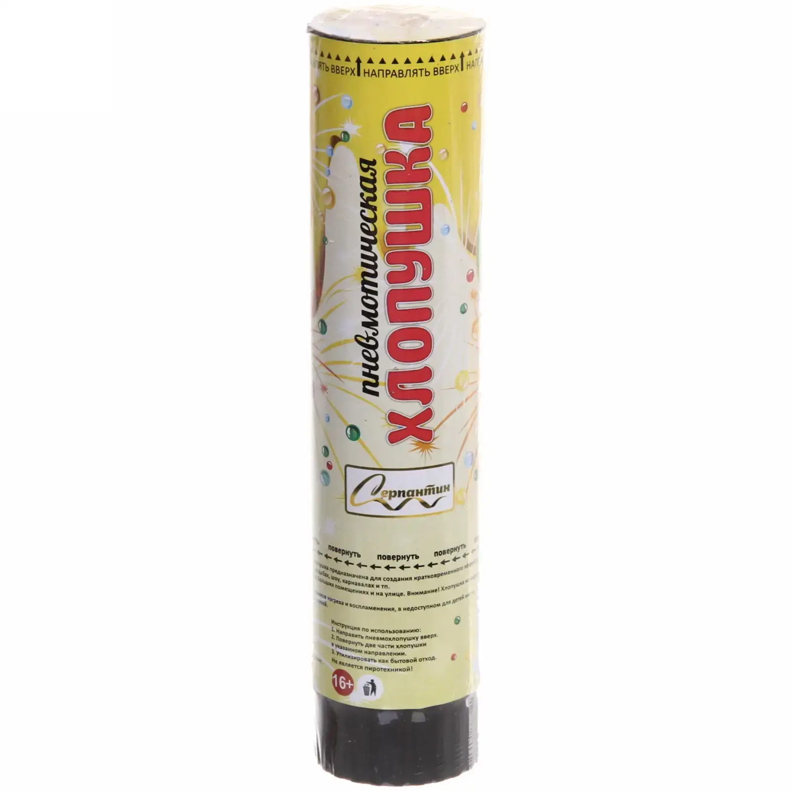 Размер пневмохлопушки составляет 20 см, что делает ее компактной и удобной для транспортировки. Упаковка выполнена в ярком желтом цвете, что дополнительно подчеркивает ее праздничный характер. Не упустите возможность сделать ваш праздник ярче и веселее с помощью этой замечательной пневмохлопушки!