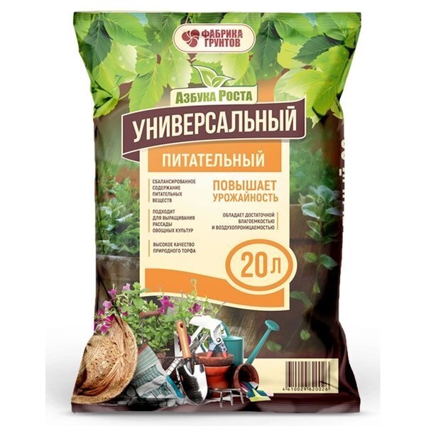 Объем упаковки составляет 20 литров, что позволяет вам обеспечить достаточное количество грунта для ваших садовых нужд. Упаковка имеет коричневый цвет с яркими элементами, что делает ее привлекательной и заметной на полке. Не упустите возможность сделать ваш сад более плодородным с почвогрунтом «Азбука Роста»!