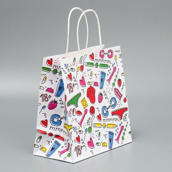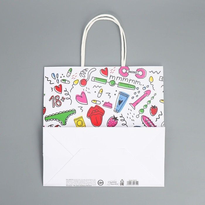 Подарочный пакет «Дарите Счастье» 22×22×11 см, крафт-бумага, яркий принт 18+