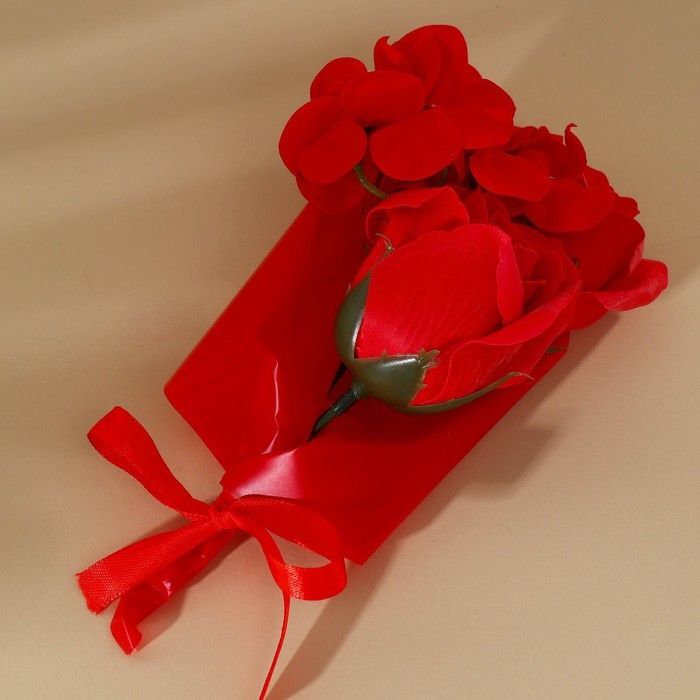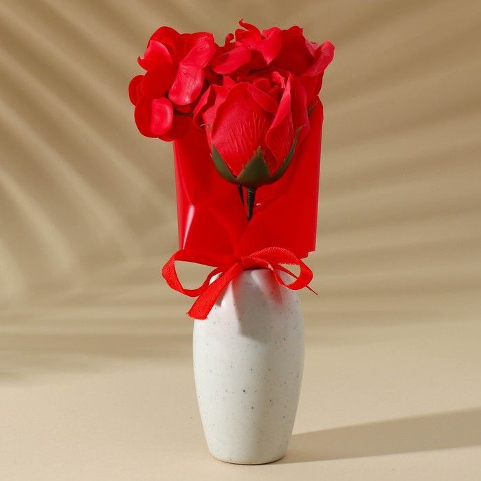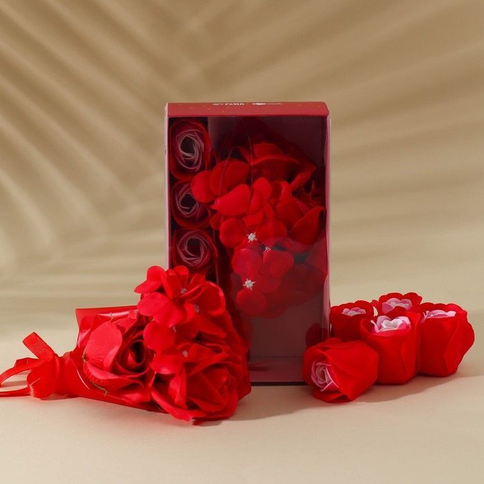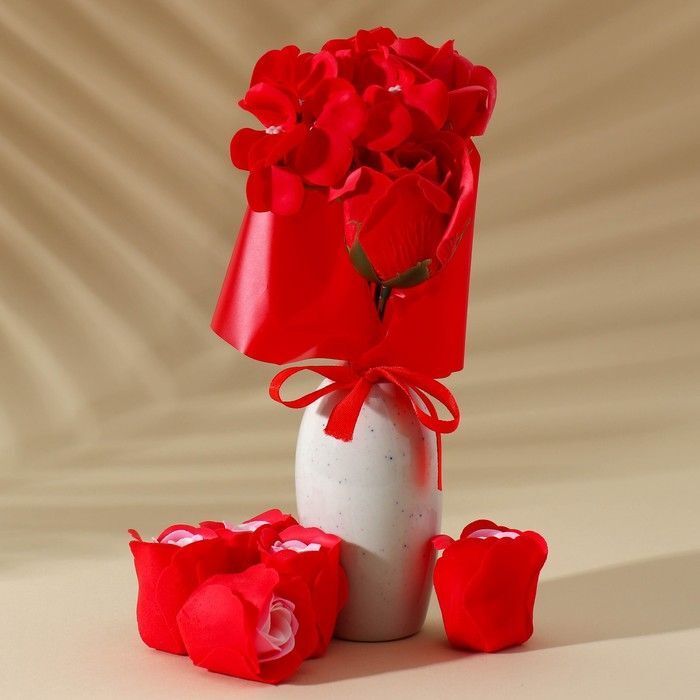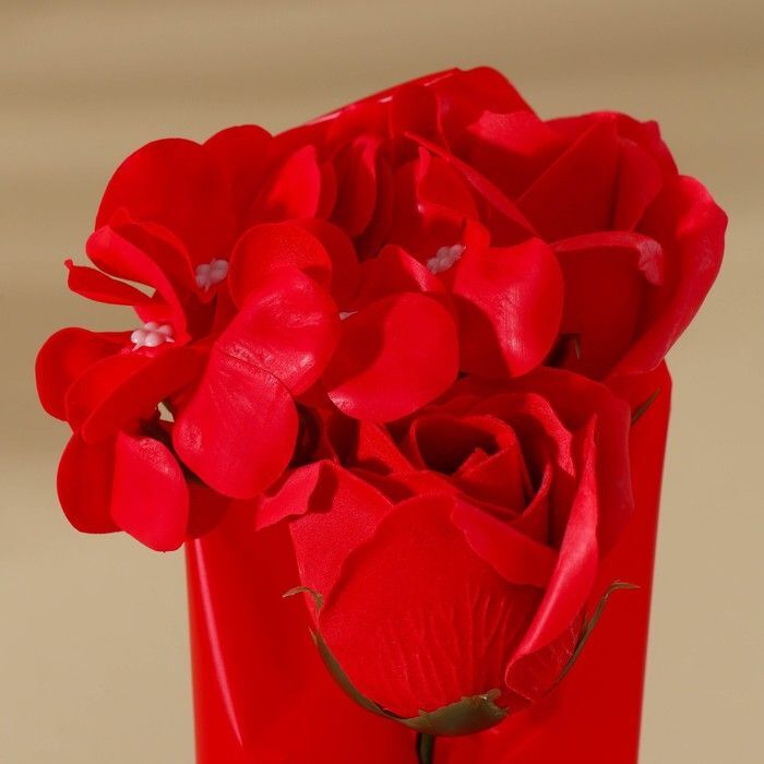 Букет состоит из 6 искусственных цветов, выполненных в ярких красных и белых оттенках, что делает его универсальным для любого интерьера. Упаковка в виде прозрачной коробки с красной лентой добавляет элегантности и делает его идеальным для подарка. Мыльные цветы изготовлены из синтетических материалов, что обеспечивает их долговечность и привлекательный внешний вид.