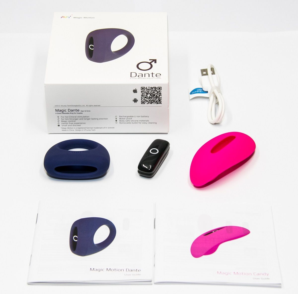Клиторальный стимулятор Candy имеет небольшие размеры и продолговатую форму, что позволяет удобно носить его в трусиках. Управление осуществляется через бесплатное приложение Magic Motion, которое позволяет задавать ритм вибрации, выбирать из девяти режимов или даже синхронизировать с музыкой. Виброкольцо Dante, выполненное из гипоаллергенного силикона, обеспечивает плотный обхват и длительную эрекцию, а также предлагает возможность дистанционного управления через смартфон.