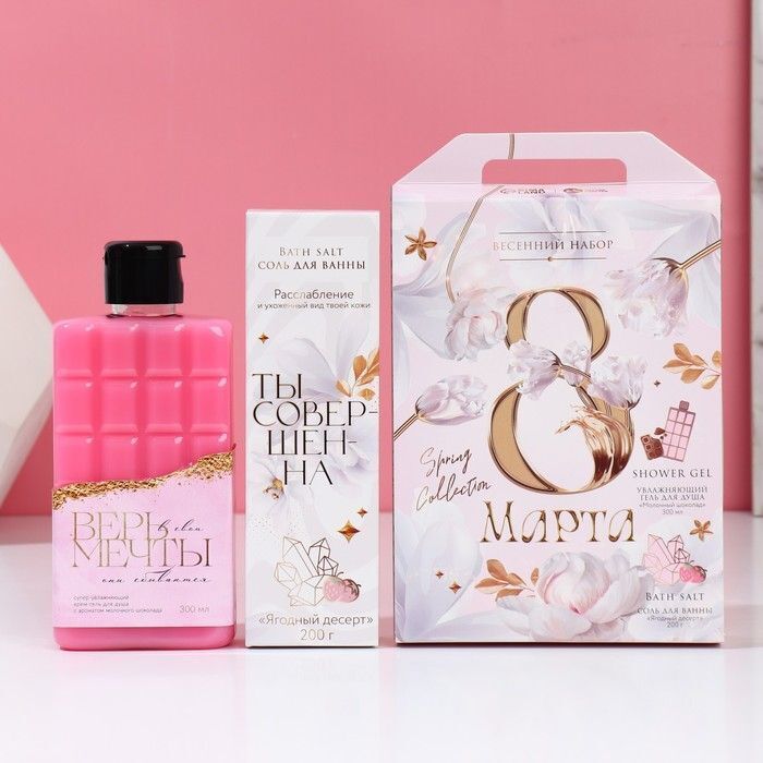 Гель для душа объемом 300 мл обладает увлажняющими свойствами и нежным ароматом молочного шоколада, который подарит вам заряд положительных эмоций. Соль для ванны весом 200 г с ароматом ягодного десерта превратит вашу ванну в настоящий спа-салон, позволяя расслабиться после долгого дня. Набор идеально подходит для подарка на любой праздник, особенно на 8 марта, когда хочется порадовать любимых женщин.