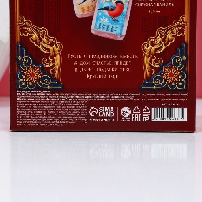 Каждый продукт в наборе имеет объем 300 мл, что обеспечивает длительное использование. Гель для душа обладает ароматом снежной ванили, а шампунь предназначен для ежедневного ухода. Упаковка выполнена из безопасного пластика и имеет удобную форму, что делает использование комфортным.