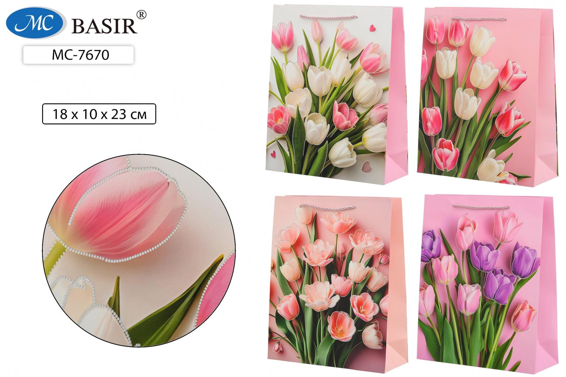 Товар представлен в ассортименте: отгружается один подарочный пакет, расцветка определяется случайным образом из доступных вариантов с изображением тюльпанов.