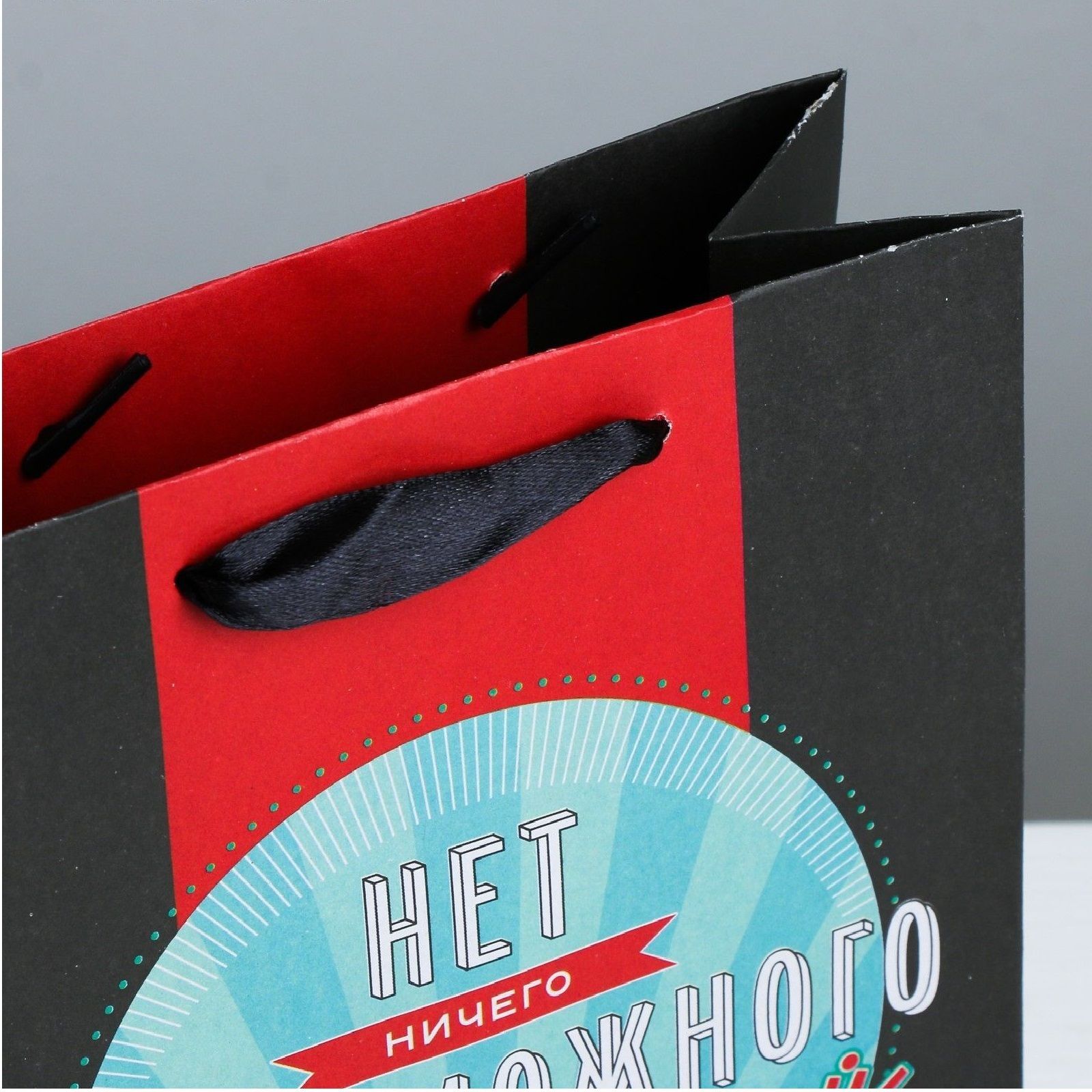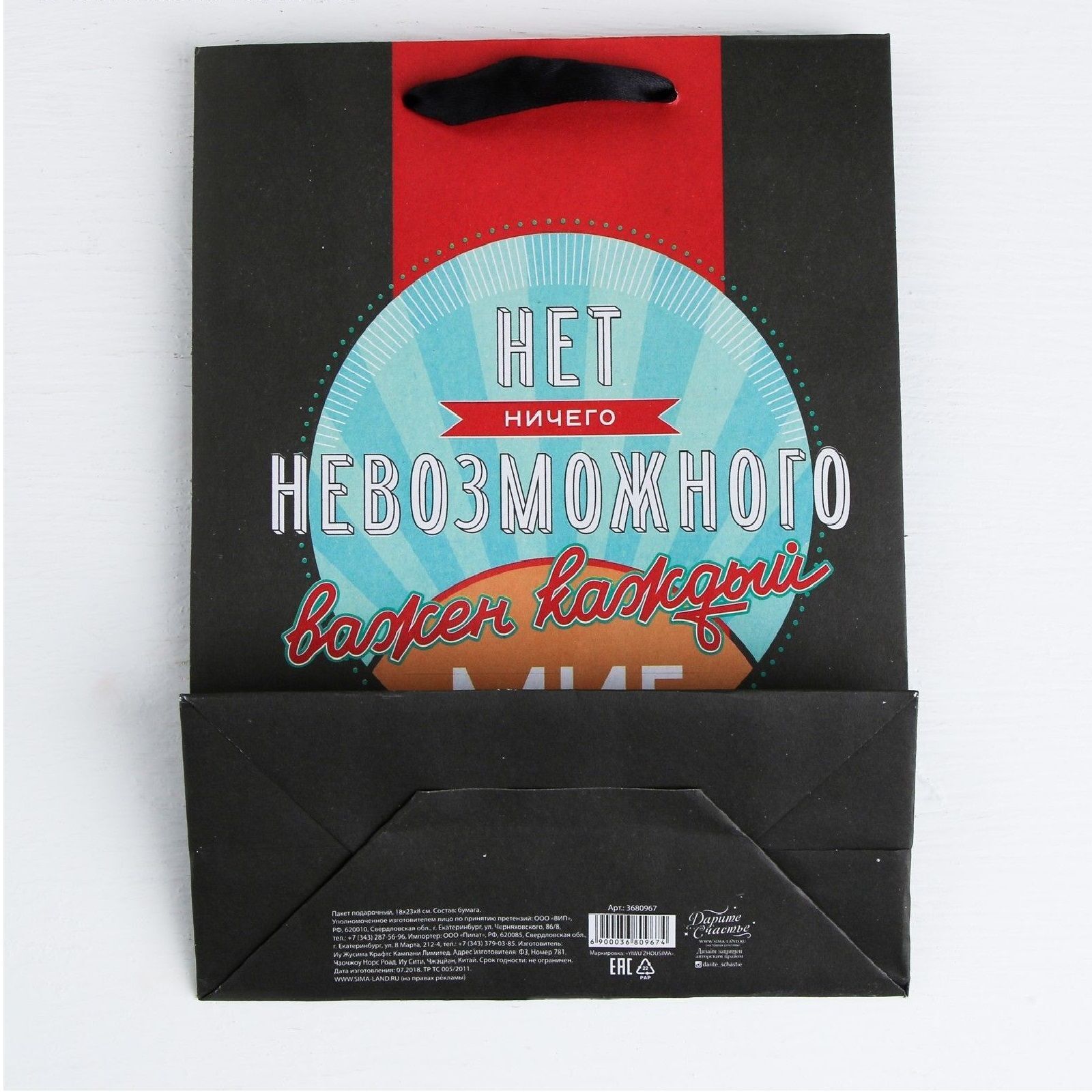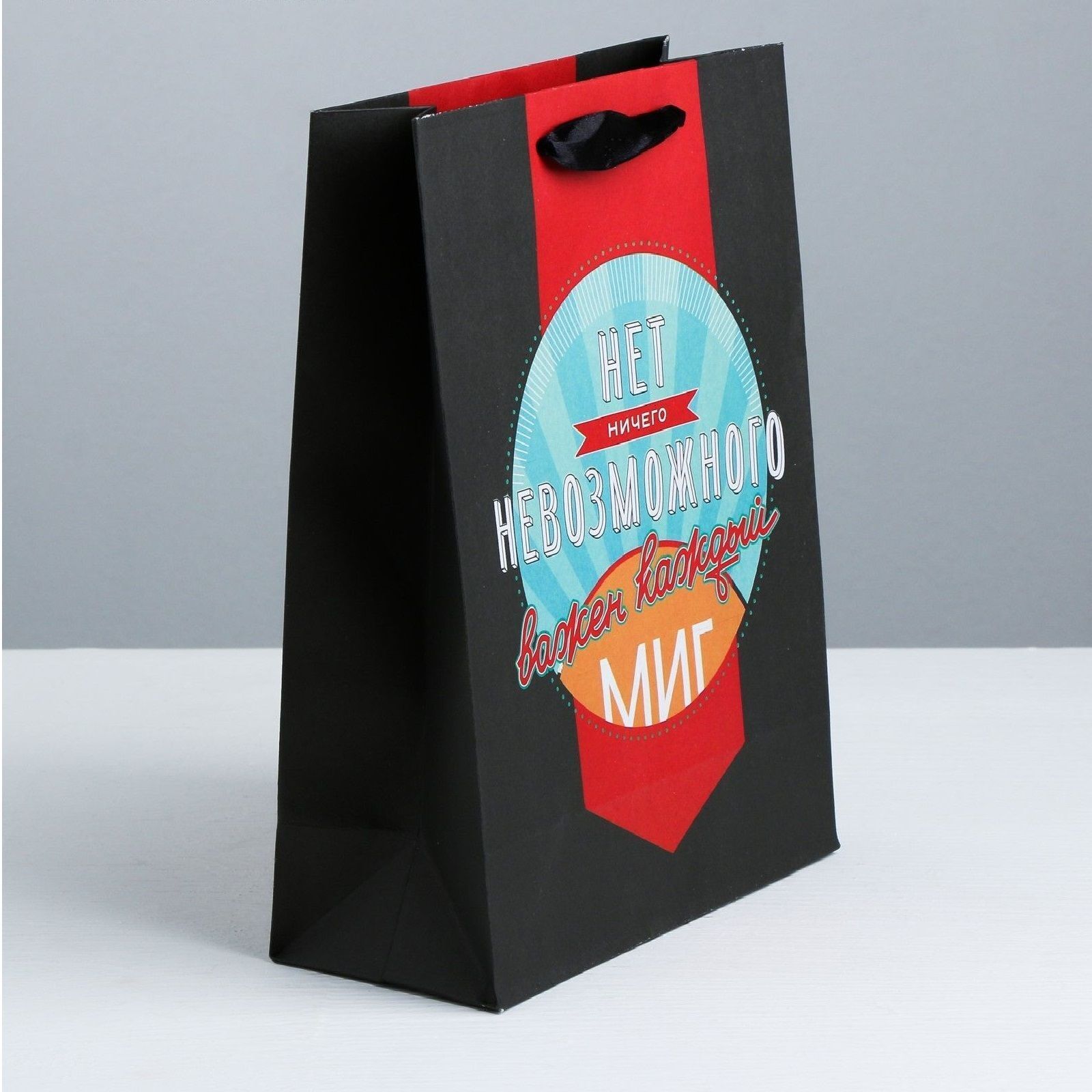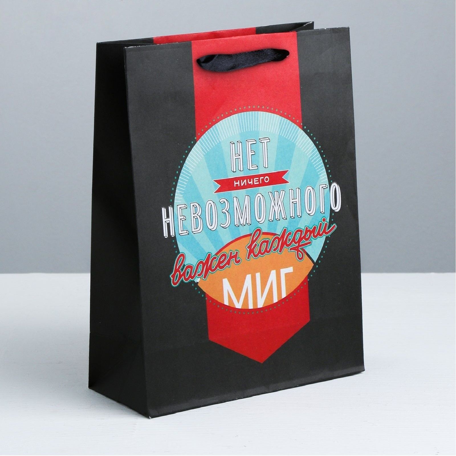 Первое впечатление решает всё. Этот элегантный черный пакет с ярким мотивирующим дизайном станет идеальной упаковкой для вашего презента.