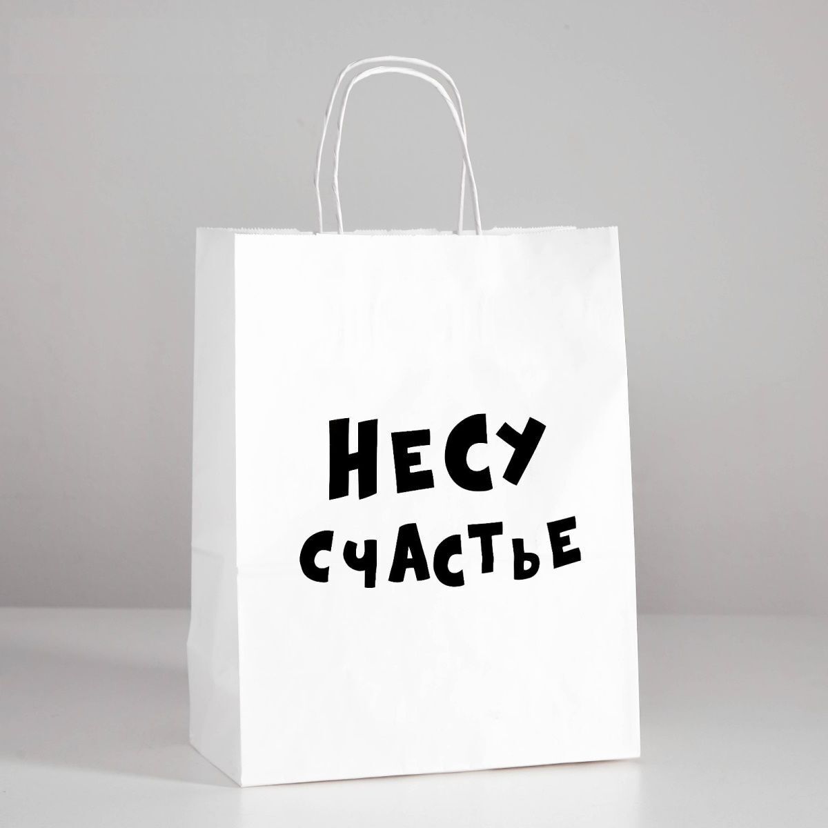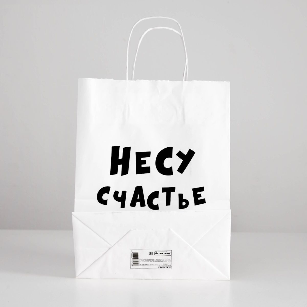 Бумажный пакет с надписью «НЕСУ СЧАСТЬЕ» сочетает лаконичный дизайн и исключительную надежность. Идеальный вариант для романтичных подарков, свадебных сюрпризов или памятных сувениров близким.