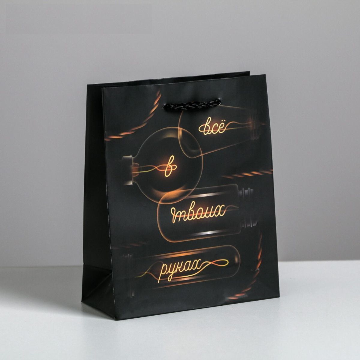 Почему стоит выбрать именно этот пакет? Во-первых, его прочность и надежность. Ламинированная поверхность защищает от повреждений, а качественная печать гарантирует, что рисунок не сотрется и не выгорит со временем. Во-вторых, его стильный дизайн с изображением ламп и текстом 'всё' создает уникальный эффект, который подчеркнет ваш подарок.