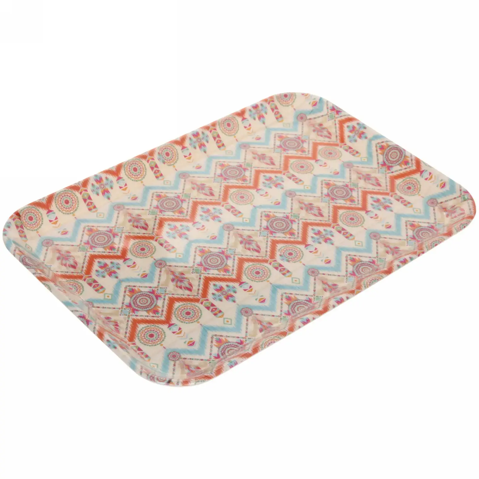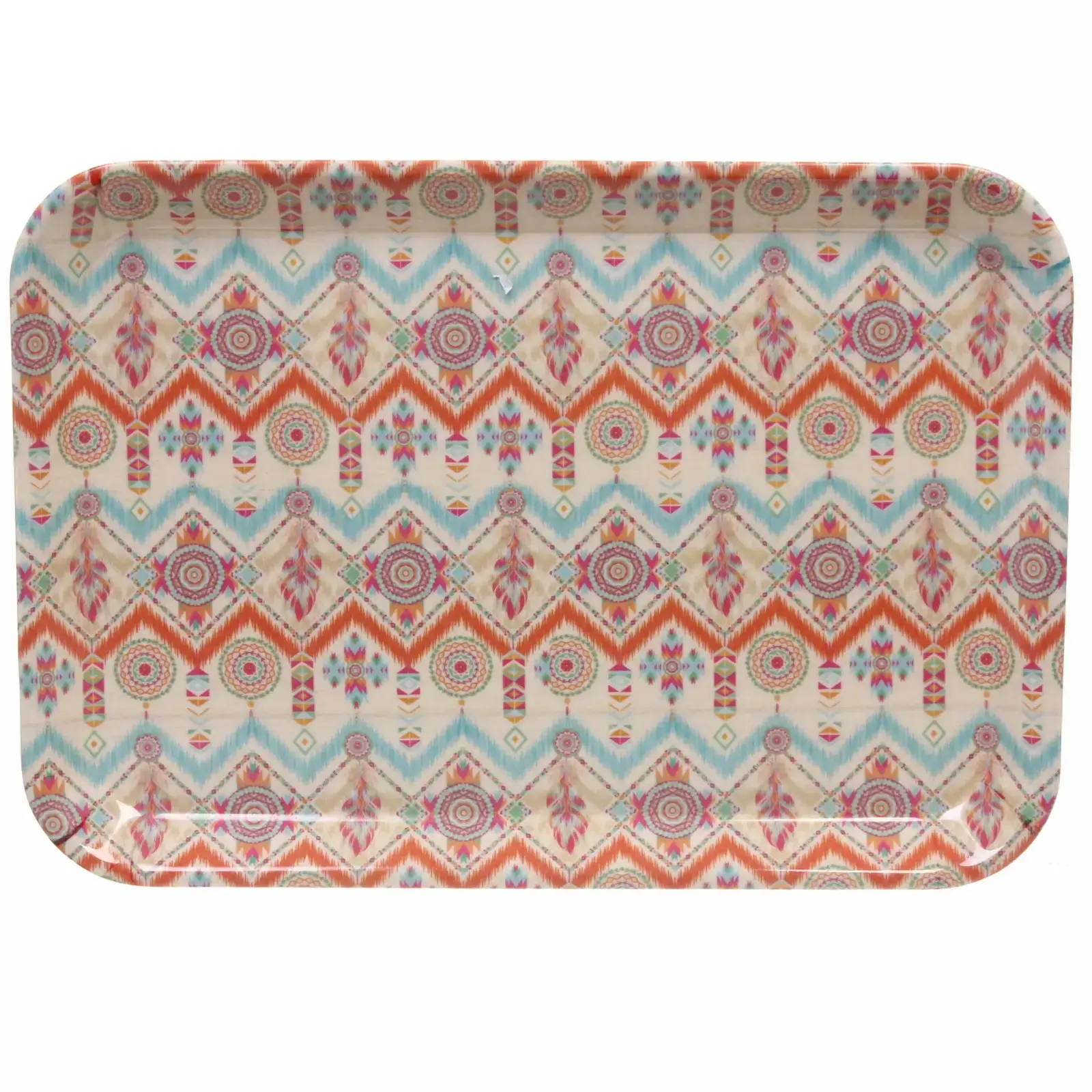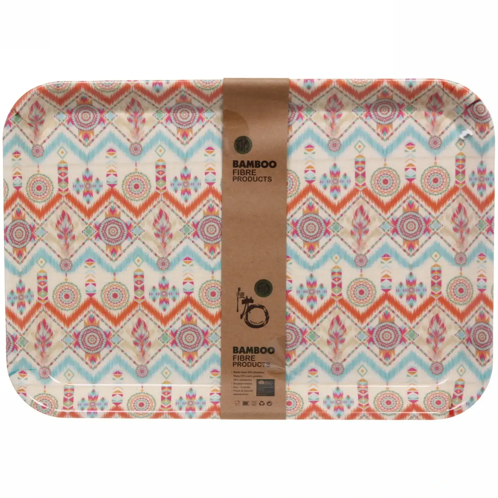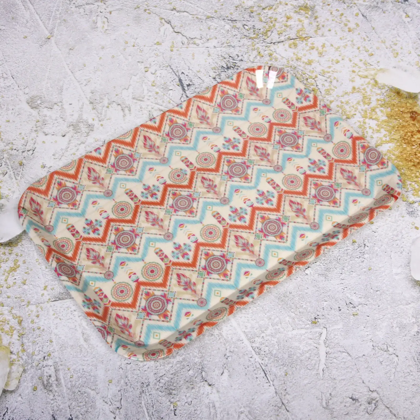 Прямоугольная форма (38,5х27 см) оптимальна для подачи блюд на 2-4 персоны. Закругленные края и компактные размеры позволяют удобно хранить поднос даже в небольшом кухонном шкафу. Геометрический орнамент в пастельных тонах гармонично впишется в интерьер в стиле сканди, эко или минимализм.