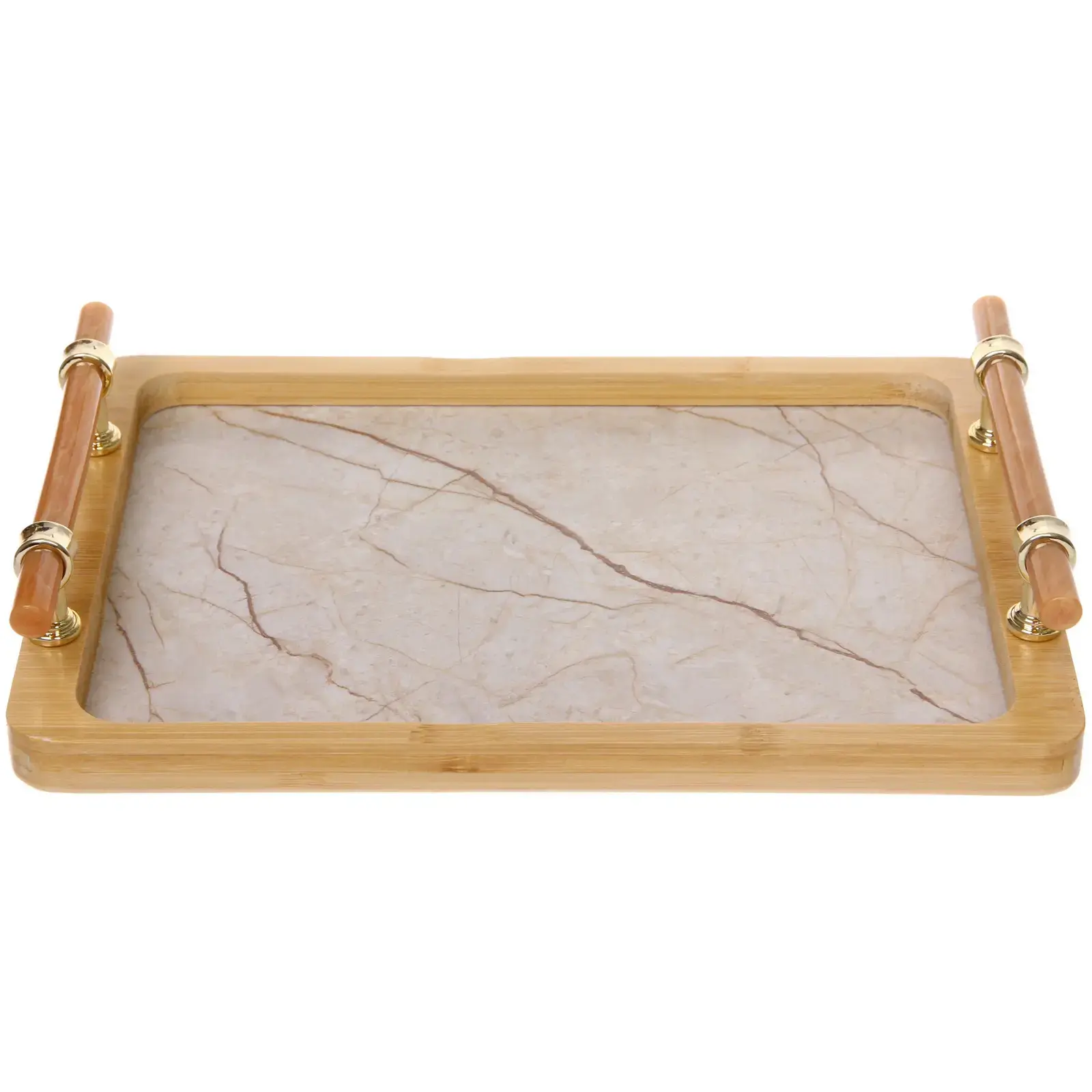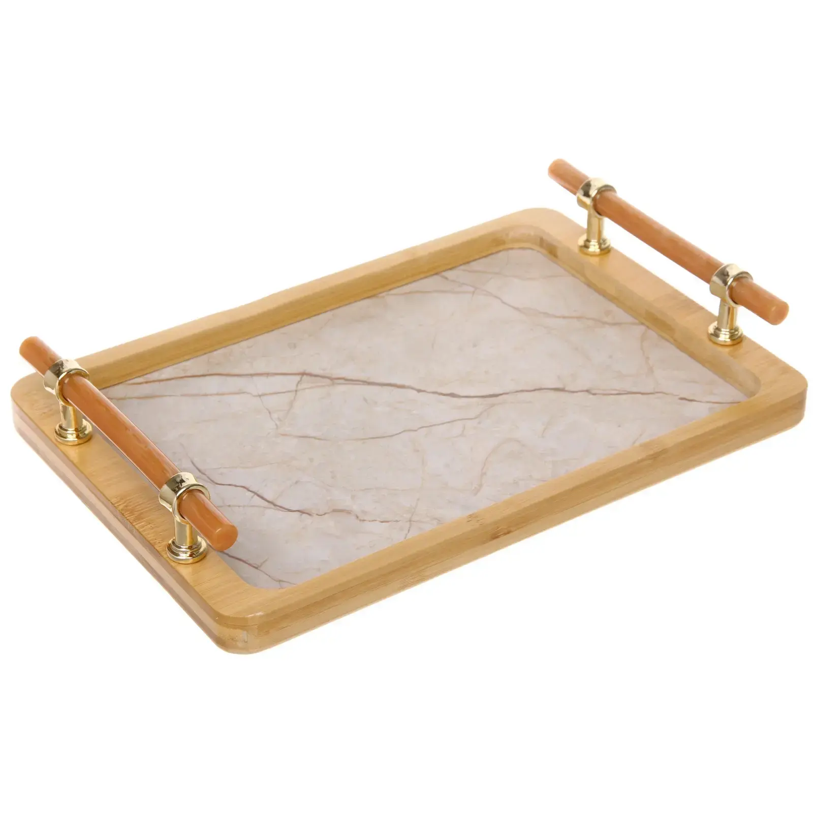 Поднос имеет размеры 30х20х5 см и выполнен из бамбука с пластиковыми ручками. Его светлый мраморный дизайн с характерными прожилками делает его универсальным для любого стиля интерьера. Этот поднос — отличный выбор для тех, кто ценит качество и стиль в каждой детали.