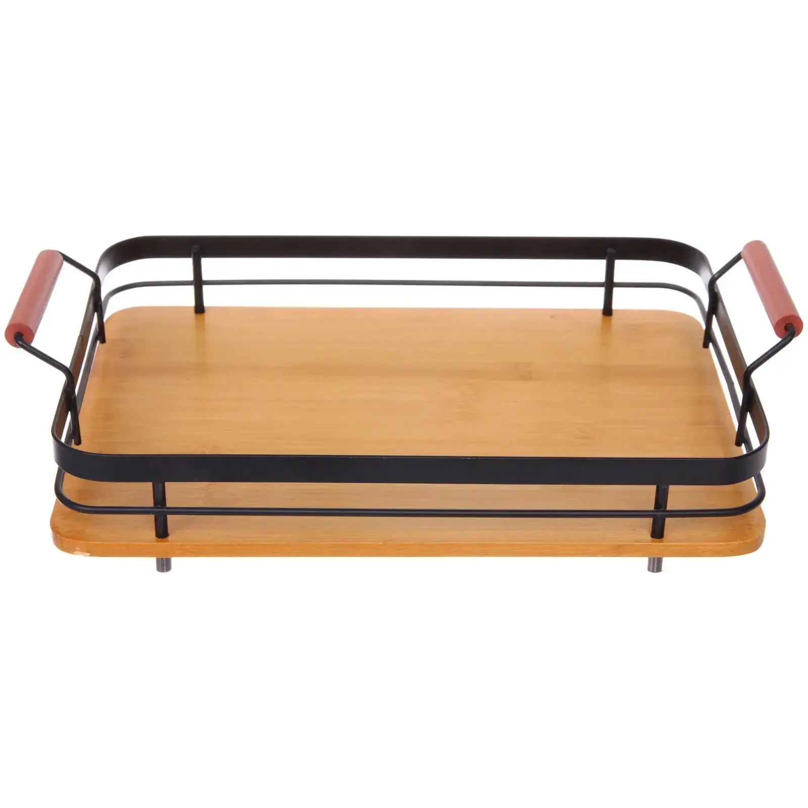 Сочетание натурального бамбука с порошковой покраской металла создаёт противоскользящую поверхность. Закруглённые края и отсутствие острых углов делают использование безопасным. Вес 1,2 кг обеспечивает устойчивость при переноске напитков.