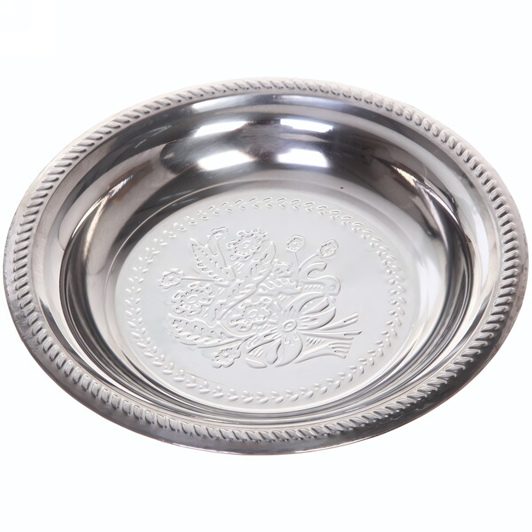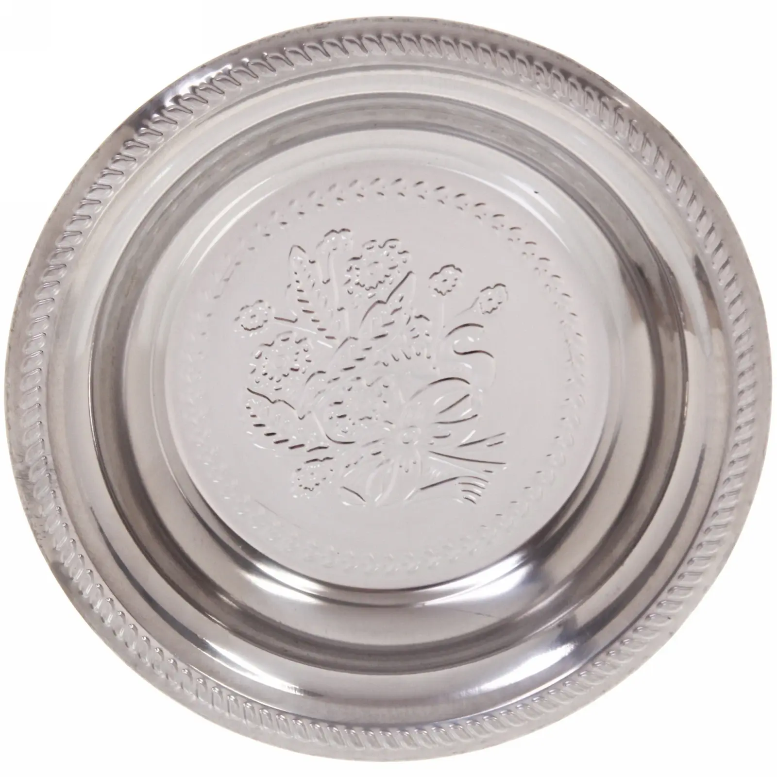Поднос имеет круглую форму и стильный рельефный рисунок, который добавляет ему уникальности. Его серебристый цвет гармонично впишется в любой интерьер, будь то классический или современный. Размер 22 см делает его идеальным для сервировки небольших порций, а также для использования в качестве декоративного элемента.
