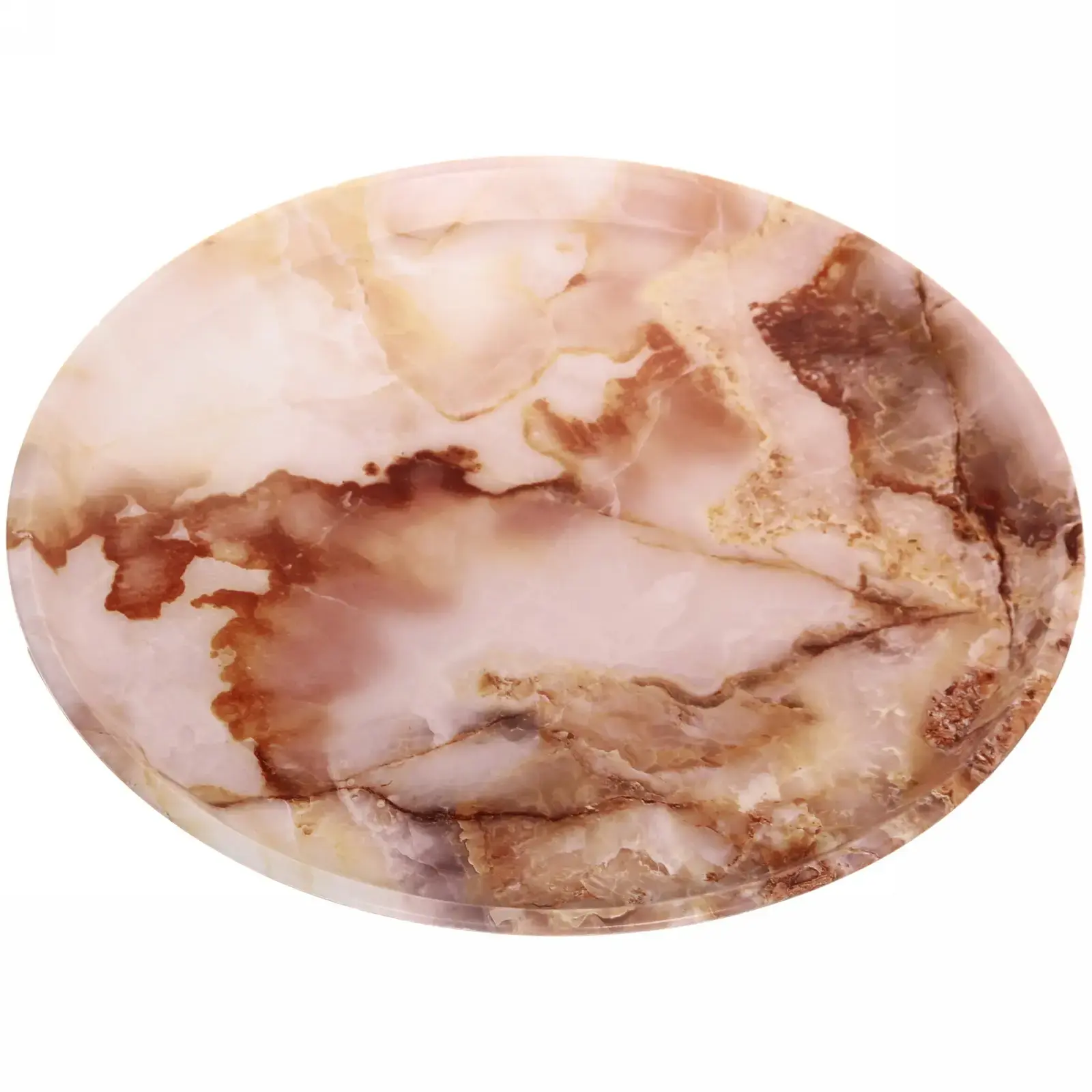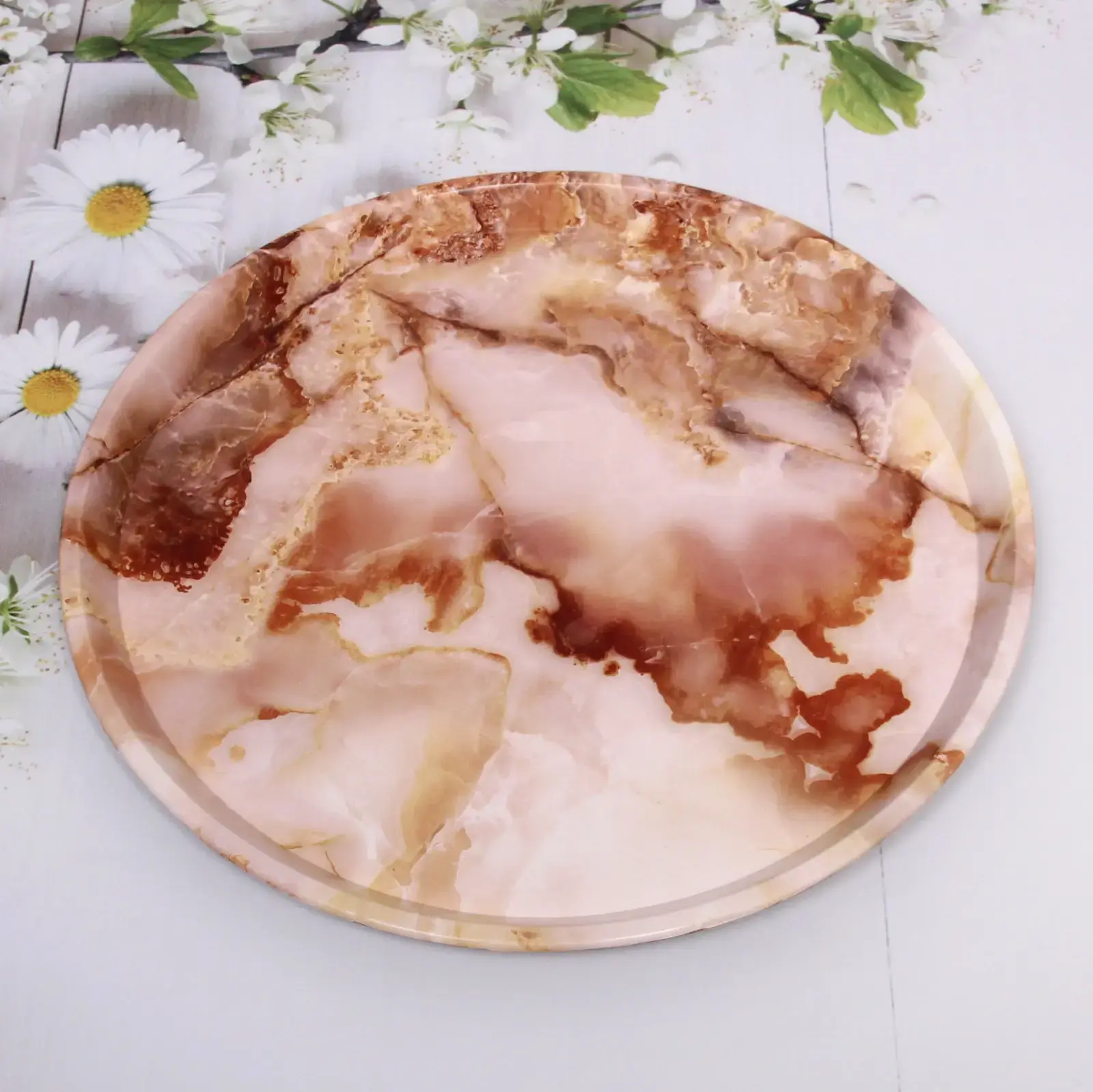 Размер подноса составляет 35,5 см в диаметре, что делает его идеальным для сервировки. Он выполнен из качественного пластика, который имитирует мрамор, что придает ему стильный и современный вид. Поднос подходит для использования как в домашних условиях, так и для организации пикников или вечеринок на свежем воздухе.