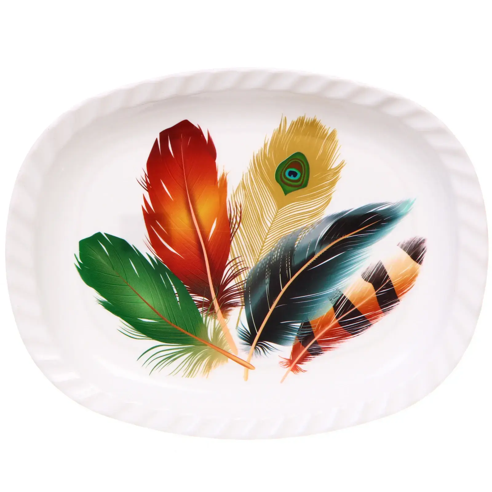 Белая основа с художественным рисунком создаёт эффект ручной росписи. Сочетание красных, зелёных и золотистых перьев добавляет торжественности сервировке. Рельефная окантовка подчёркивает изящные линии изделия.