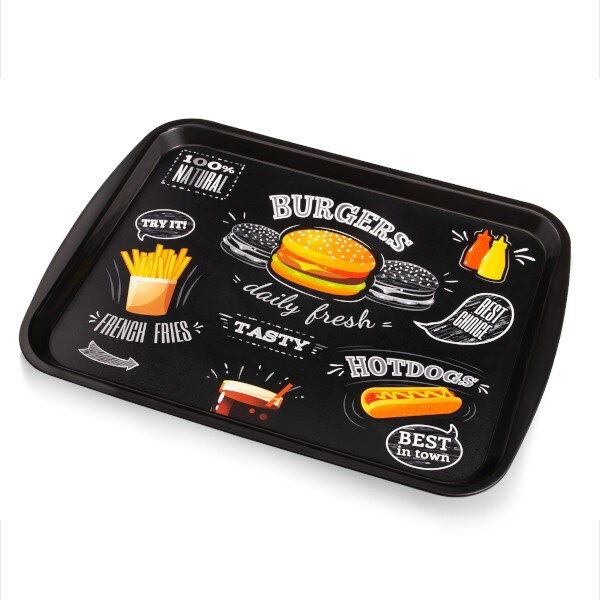 Поднос "Ретро" с современным фастфуд-дизайном сочетает практичность и эстетику. Яркие иллюстрации бургеров, картофеля фри и соусов создают атмосферу динамичного города, превращая обычную сервировку в элемент декора.