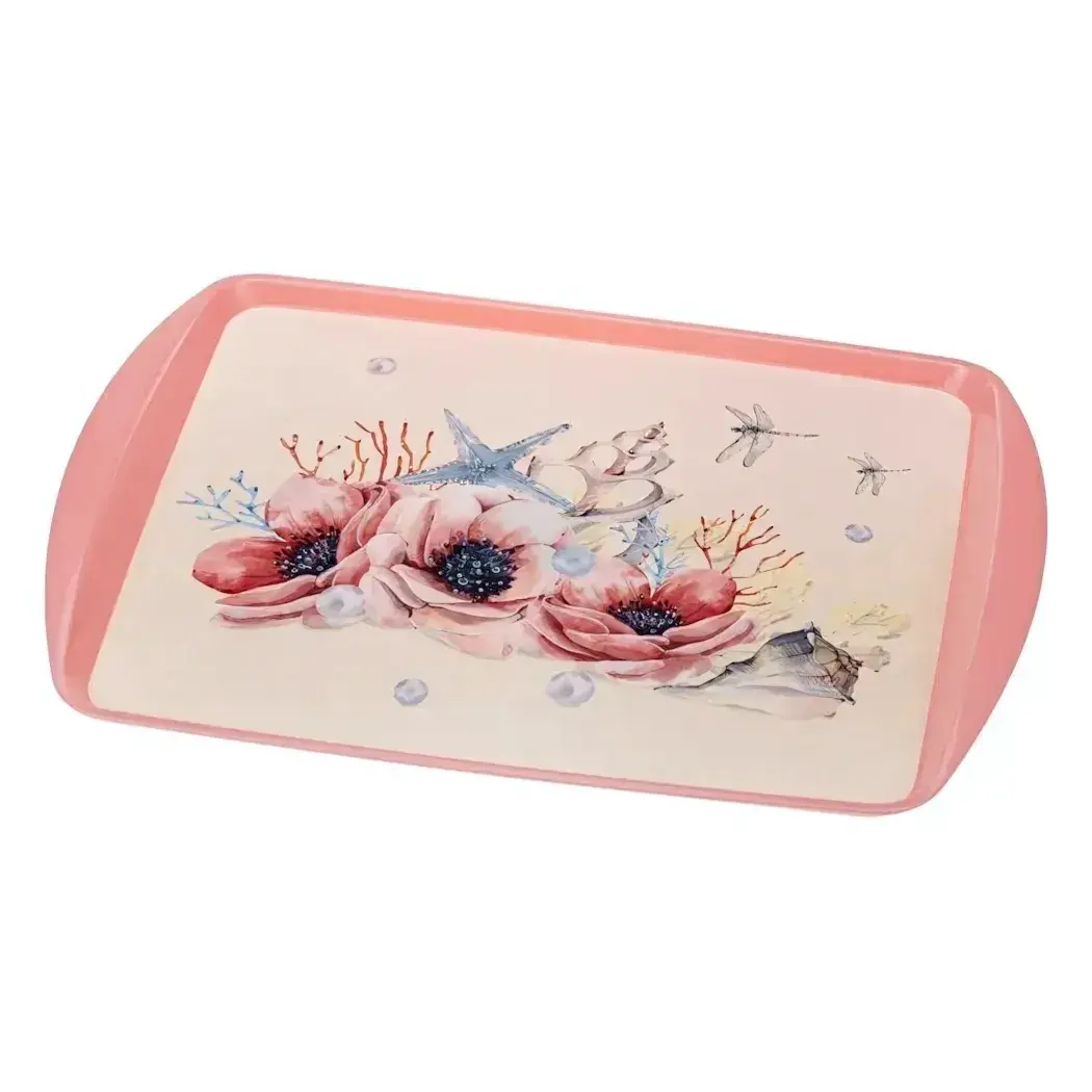 Цветовая гамма изделия отгружается в ассортименте: вы можете получить поднос с преобладанием розовых, голубых или персиковых оттенков. Все элементы рисунка выполнены безопасными красителями, разрешёнными для контакта с пищевыми продуктами.
