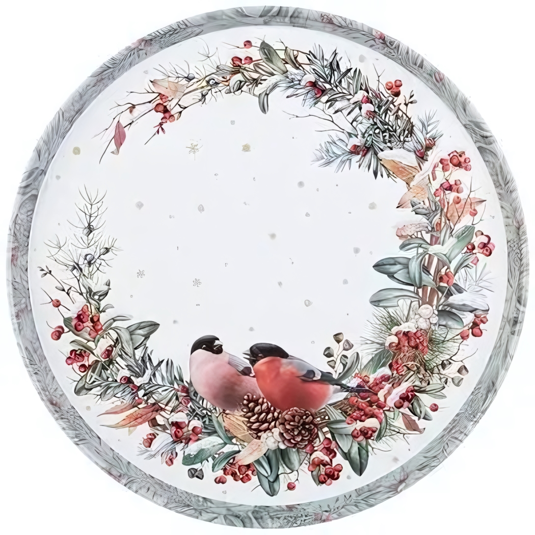 Создайте атмосферу тепла и праздника за столом с этим изысканным круговым подносом из коллекции "Снегири". Его дизайн объединяет белый фон, яркий орнамент из хвои, красных ягод и шишек, а также нежное изображение снегирей — символа зимних чудес и домашнего уюта.