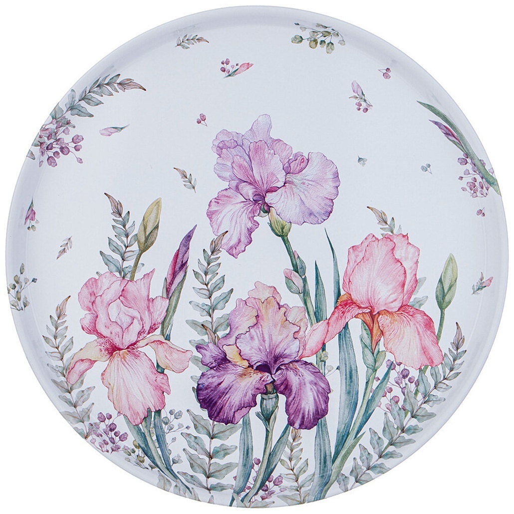 С таким подносом любая сервировка станет особенной. Элегантный цветочный узор с нежными ирисами в розовых и фиолетовых оттенках на белом фоне создаёт атмосферу уюта и гармонии, а золотистое обрамление придаёт изысканности. Круглая форма диаметром 33 см и стенки высотой 2,1 см обеспечивают удобное размещение и перенос посуды, напитков или закусок.