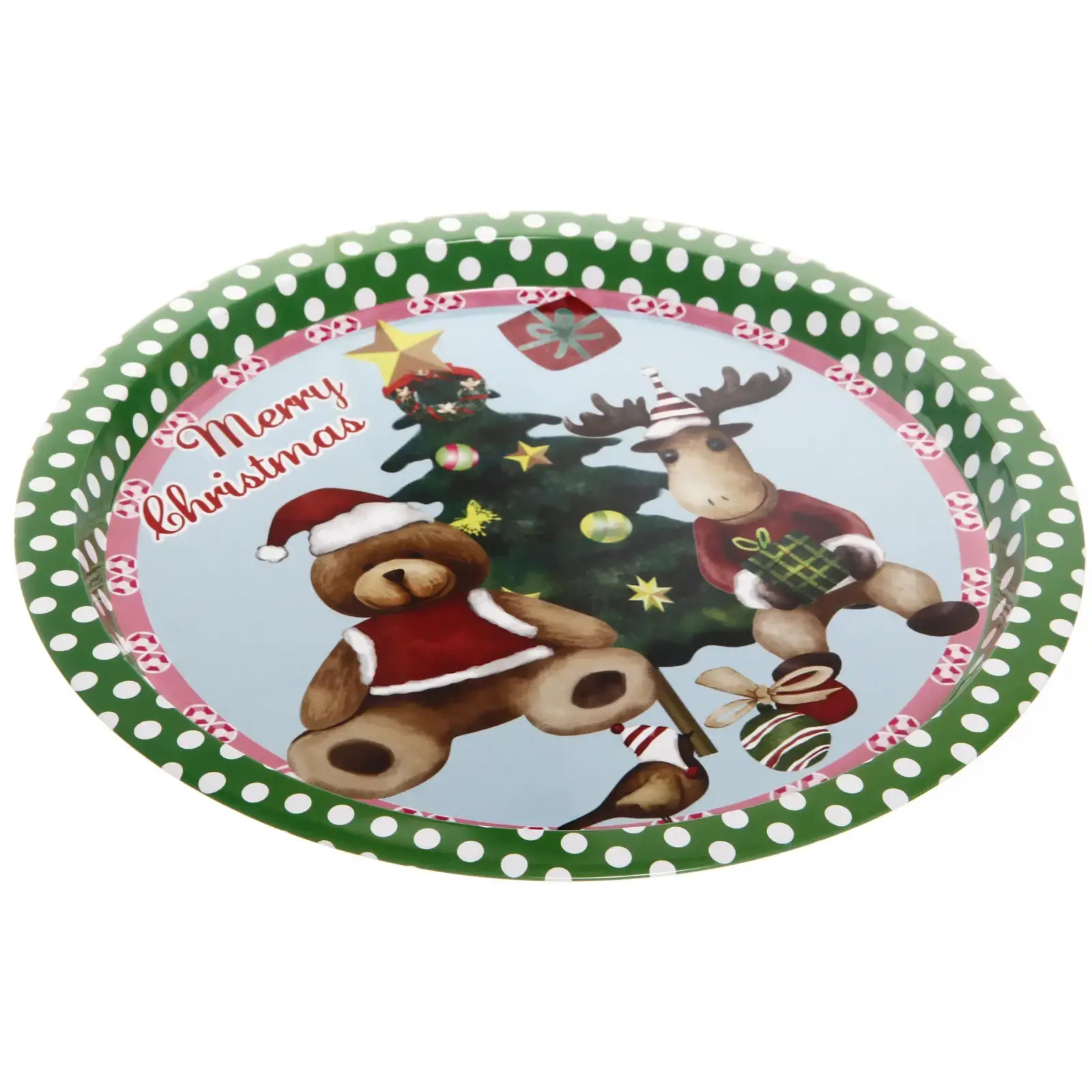 Прочный жестяной материал обеспечивает долговечность использования. Классический новогодний дизайн с красно-зелеными акцентами идеально впишется в праздничную атмосферу. Размер 32 см оптимален для сервировки различных блюд.