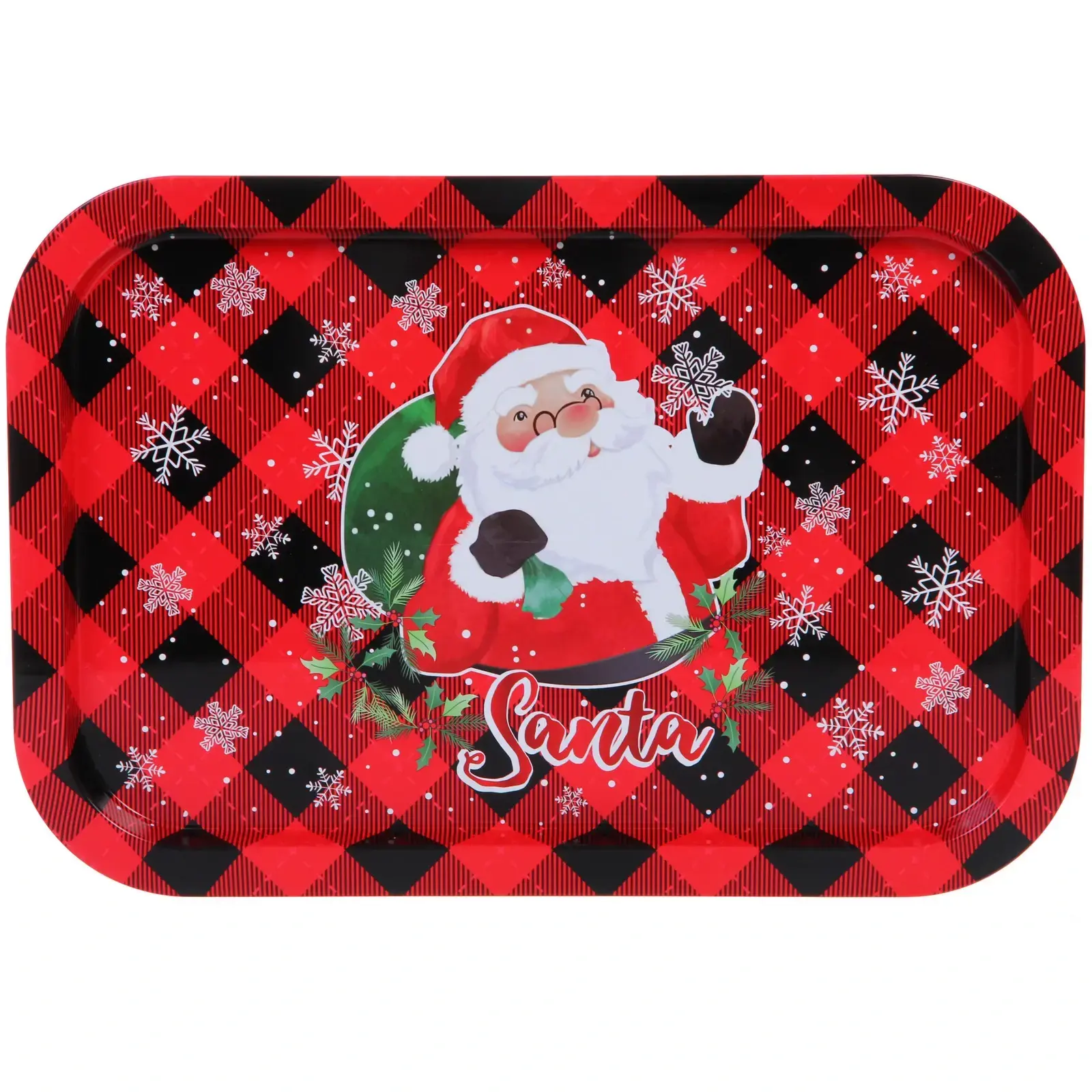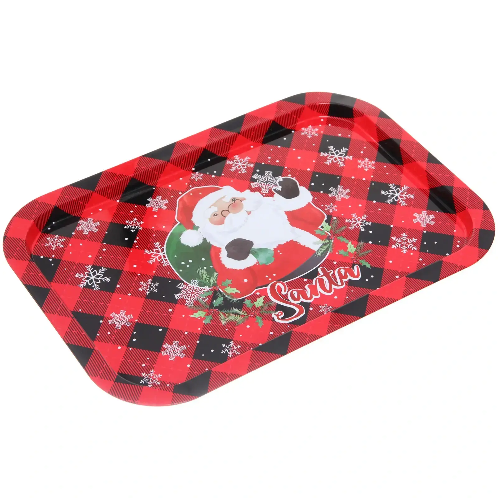 Поднос выполнен в красно-черной клетчатой расцветке, что делает его стильным и современным. Он украшен изображениями снежинок и зелеными веточками, что подчеркивает новогоднюю тематику. Такой поднос станет отличным подарком для друзей и родных, а также незаменимым аксессуаром для вашего праздничного стола.