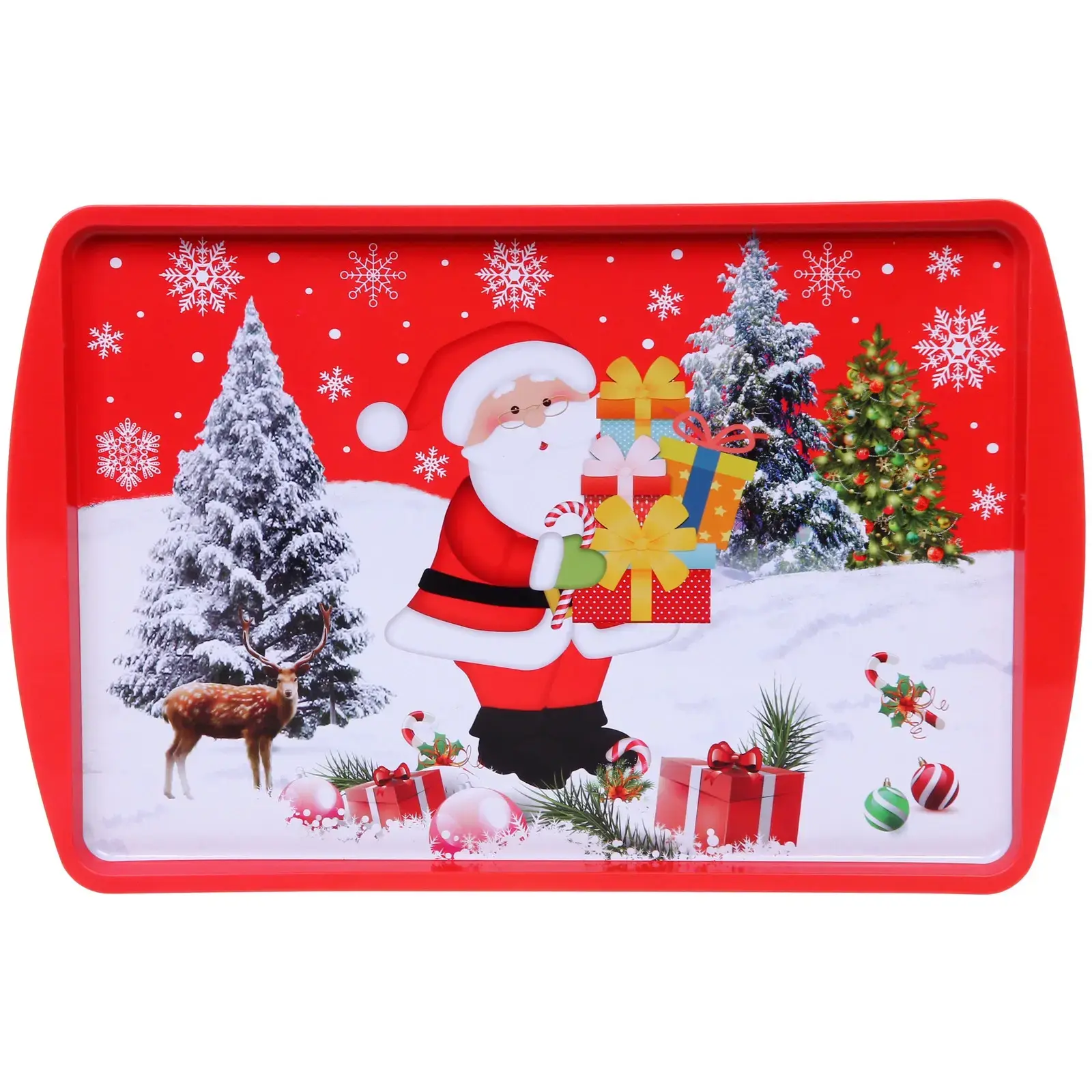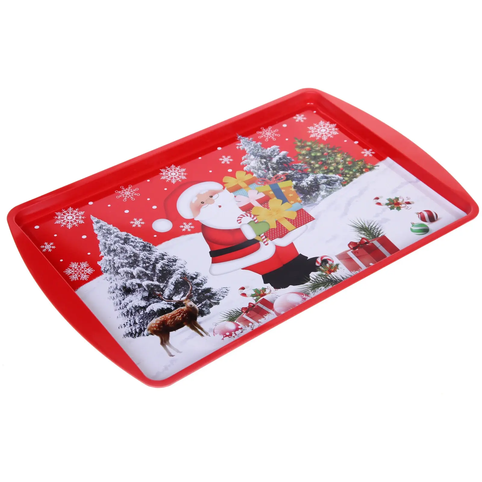 Поднос имеет прямоугольную форму и продуманный дизайн, который включает в себя изображения Санта-Клауса, оленей, снежных деревьев и новогодних украшений. Вся композиция создает ощущение праздника и радости. Не упустите возможность добавить этот уникальный поднос к своей коллекции для новогодних вечеров!