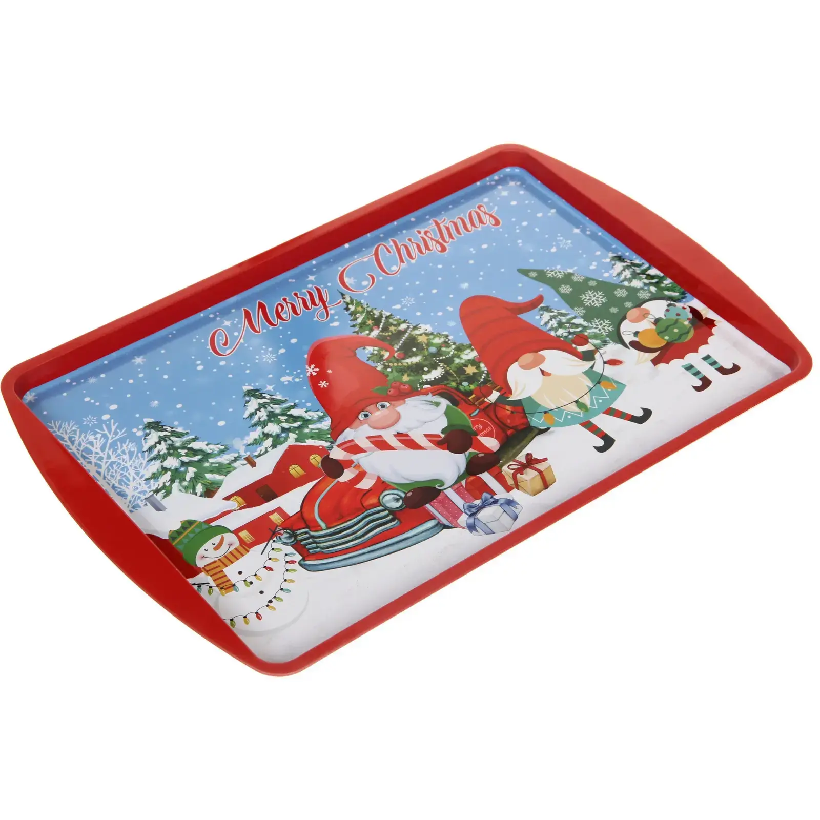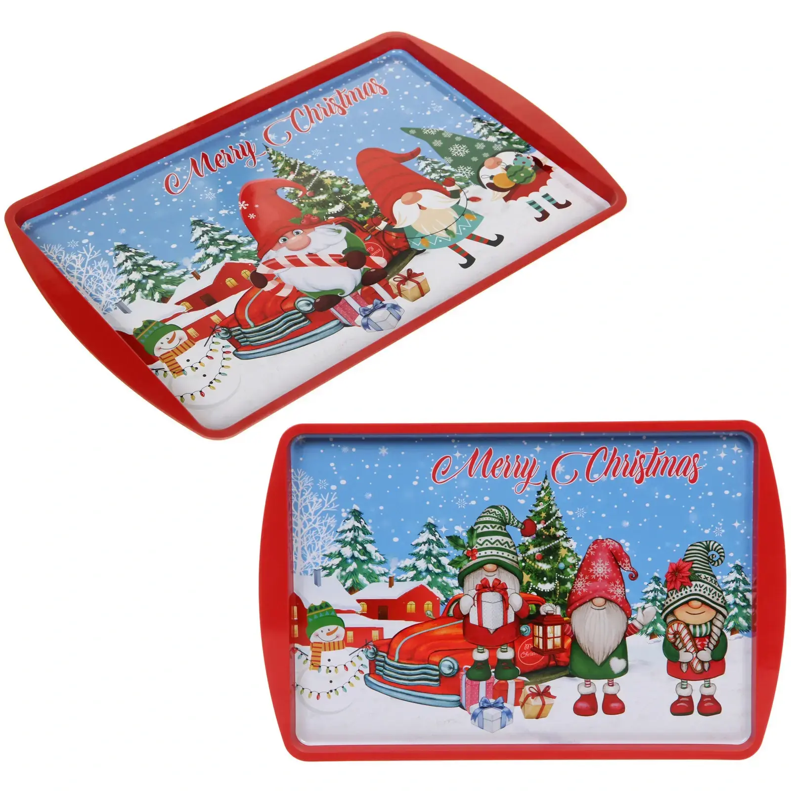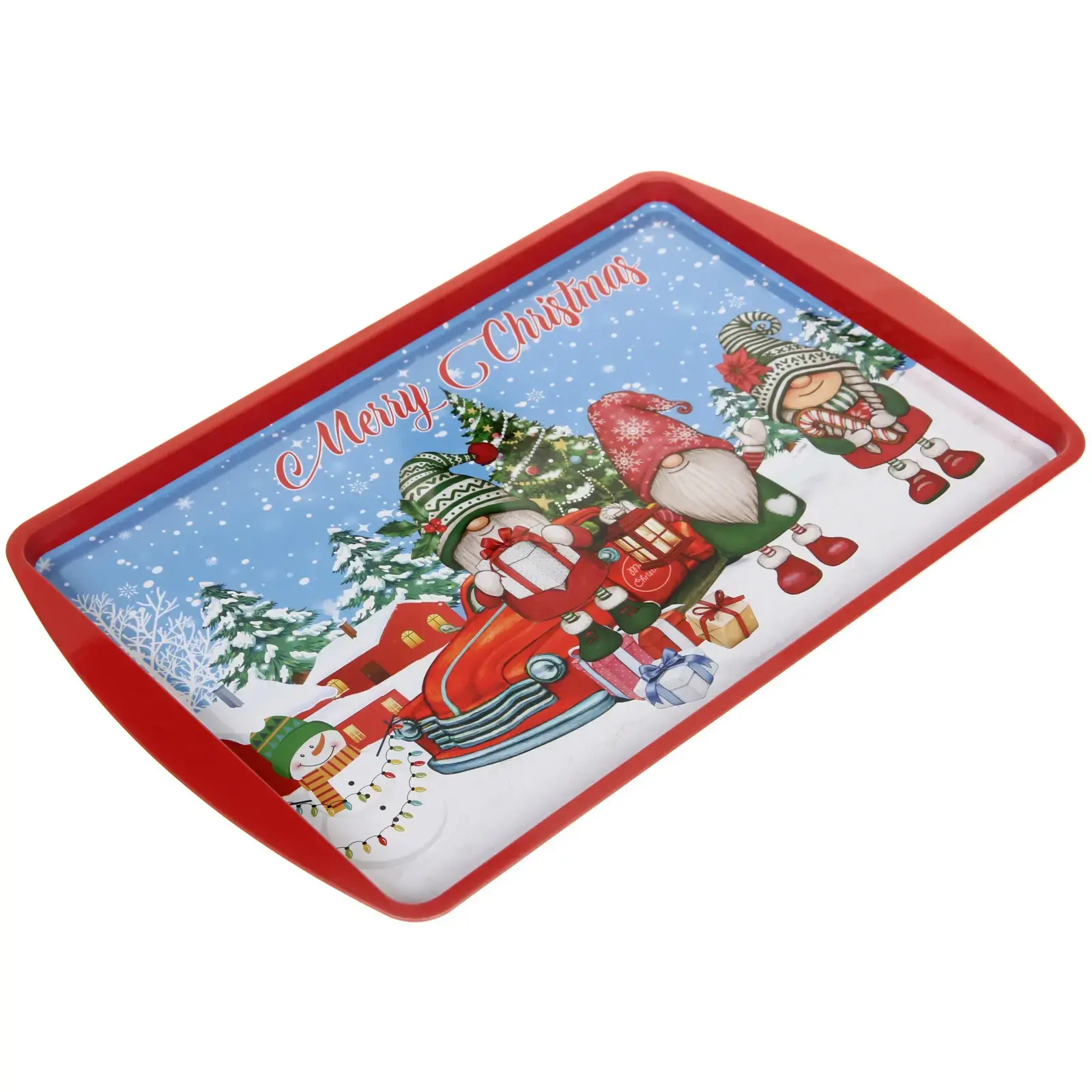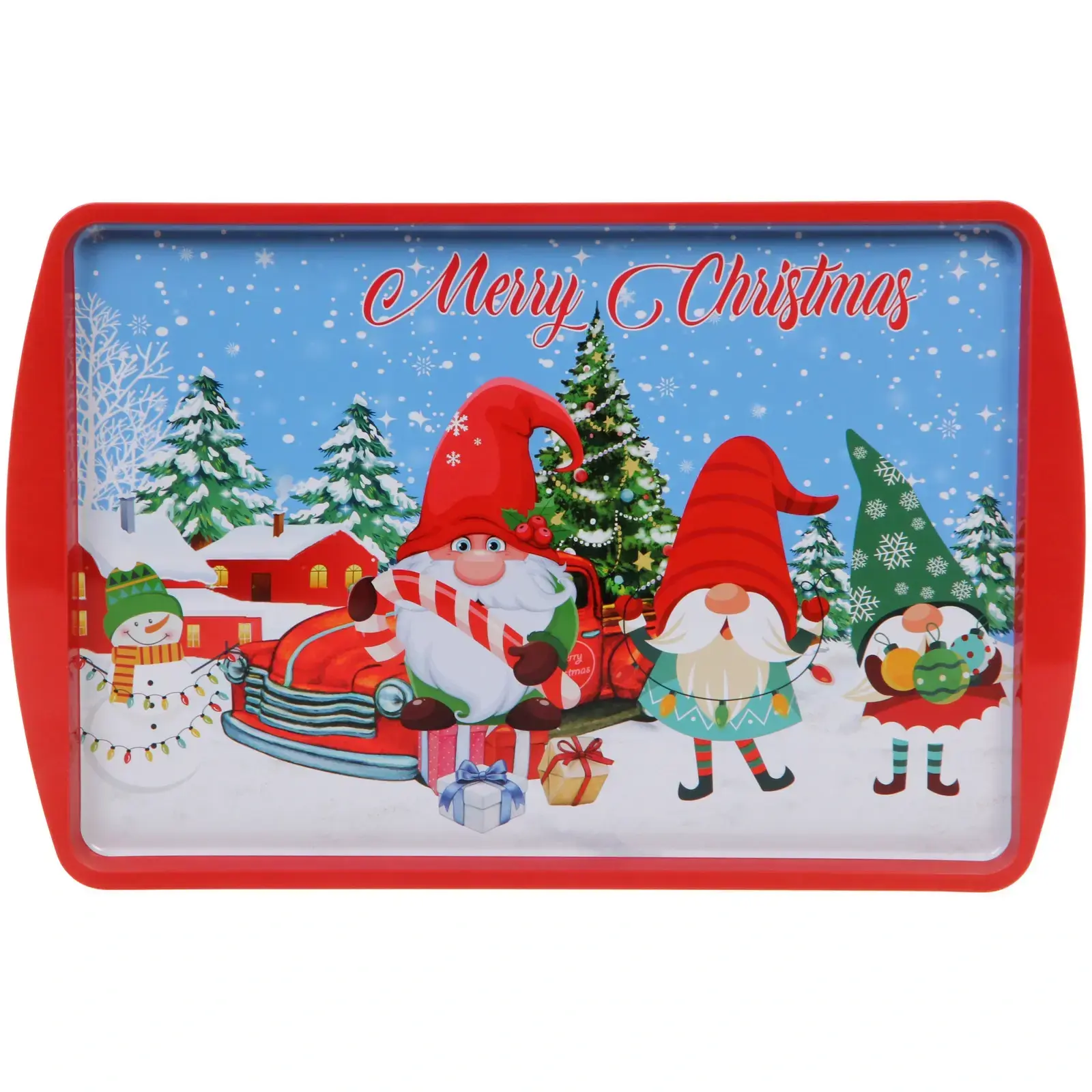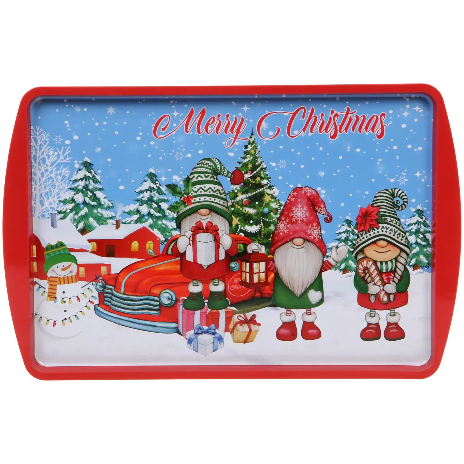 Поднос новогодний жестяной 38х24см, дизайн 'Веселые гномы на машине', красная окантовка
