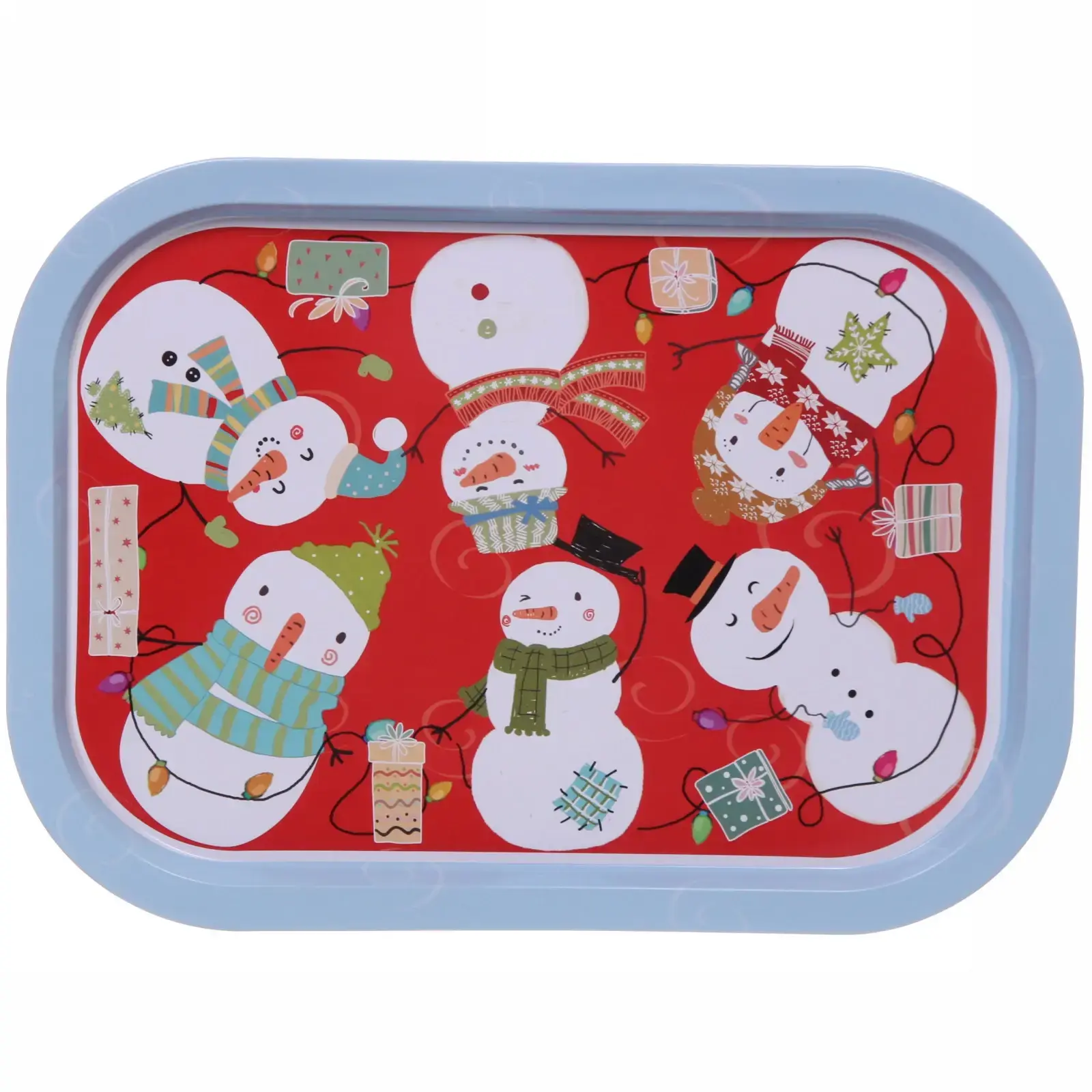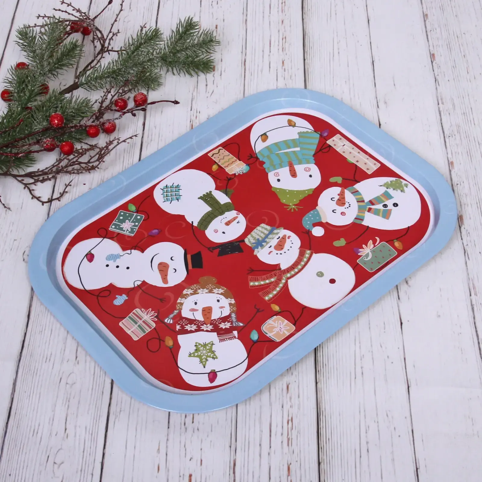 Поднос жестяной «Веселые снеговики», 40х28см, новогодний декор, красный с голубой окантовкой