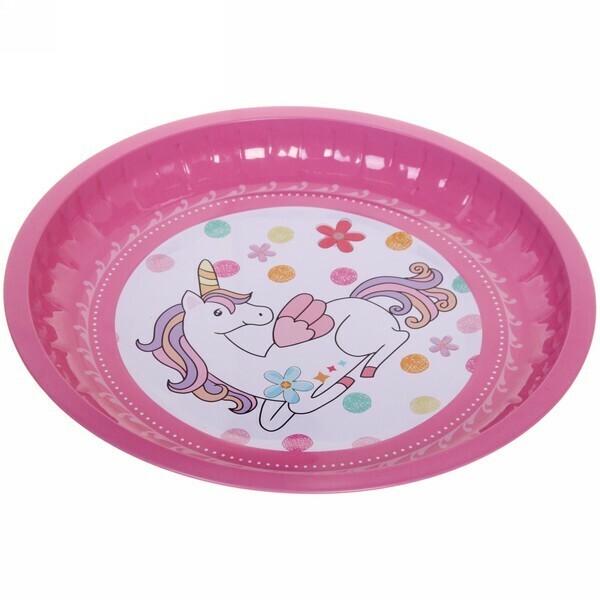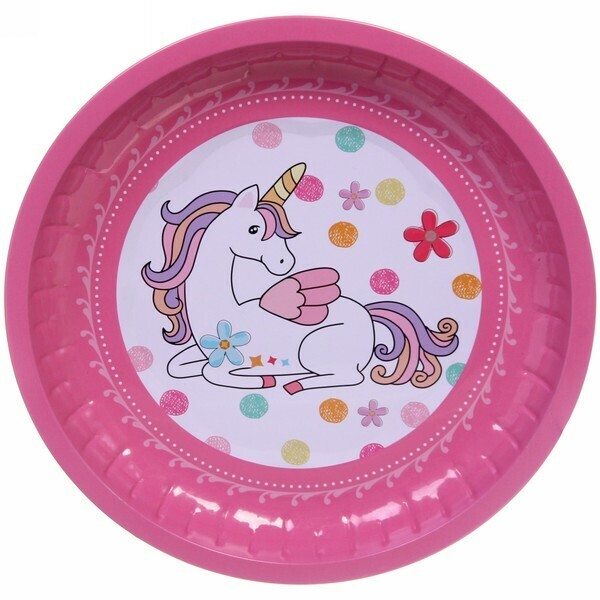 Поднос выполнен из качественной жести, что обеспечивает его долговечность и устойчивость к повреждениям. Яркий розовый цвет и изображение единорога делают его привлекательным для детей. Размер 26,5 см позволяет использовать поднос для различных целей, от сервировки до декора. Этот поднос станет незаменимым помощником в организации детских праздников и повседневного использования.