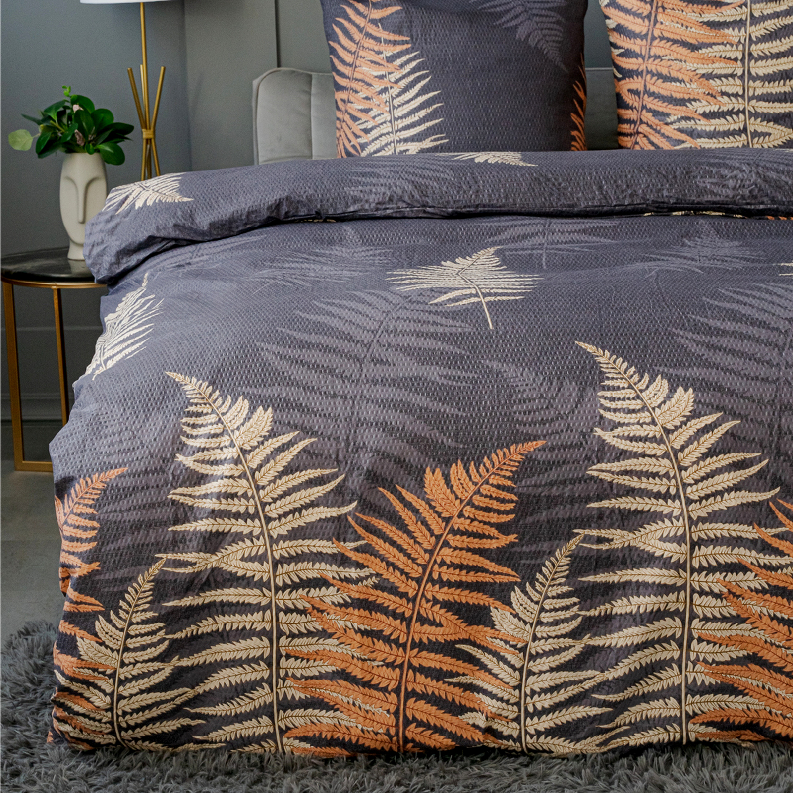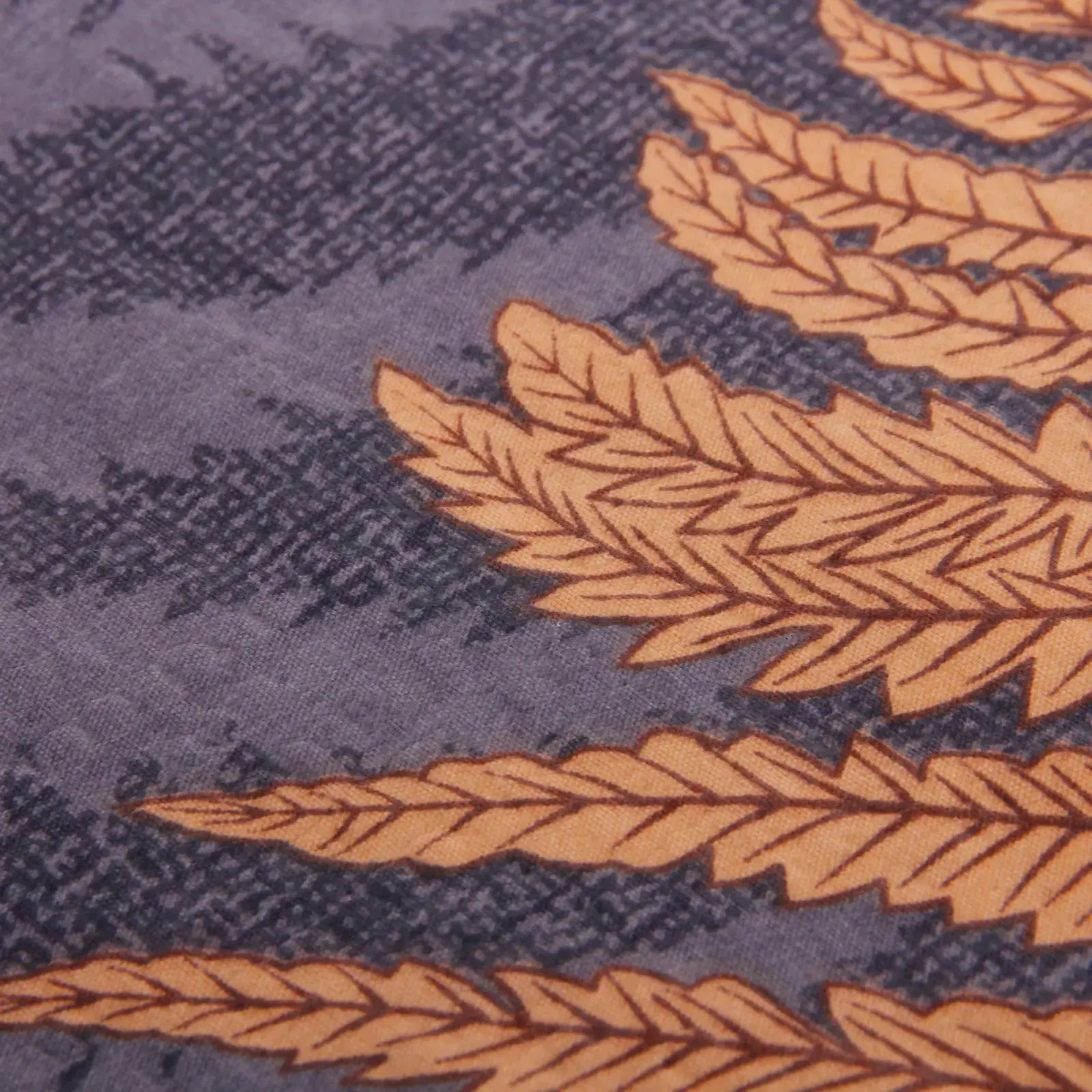 Темно-синий фон с изящным рисунком листьев в оранжевых и бежевых тонах добавит элегантности любому интерьеру. Подходит для стандартных 1,5-спальных кроватей, легко сочетается с различными текстильными аксессуарами.