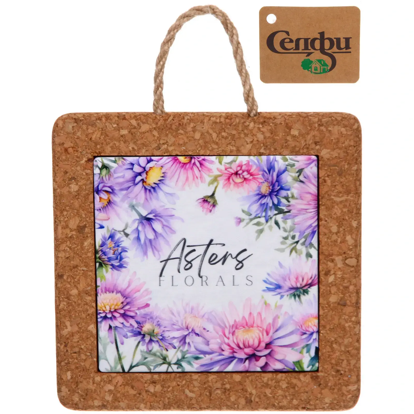 Размер: 14,5x14,5см. Материалы: пробка, пластик. В центре — цветная вставка с композициями из астры. Квадратная форма с закруглёнными краями. Верхняя петля позволяет подвесить изделие на крючок или ручку. Мягкая текстура пробки приятно ощущается на ощупь и предотвращает царапины на поверхности мебели.