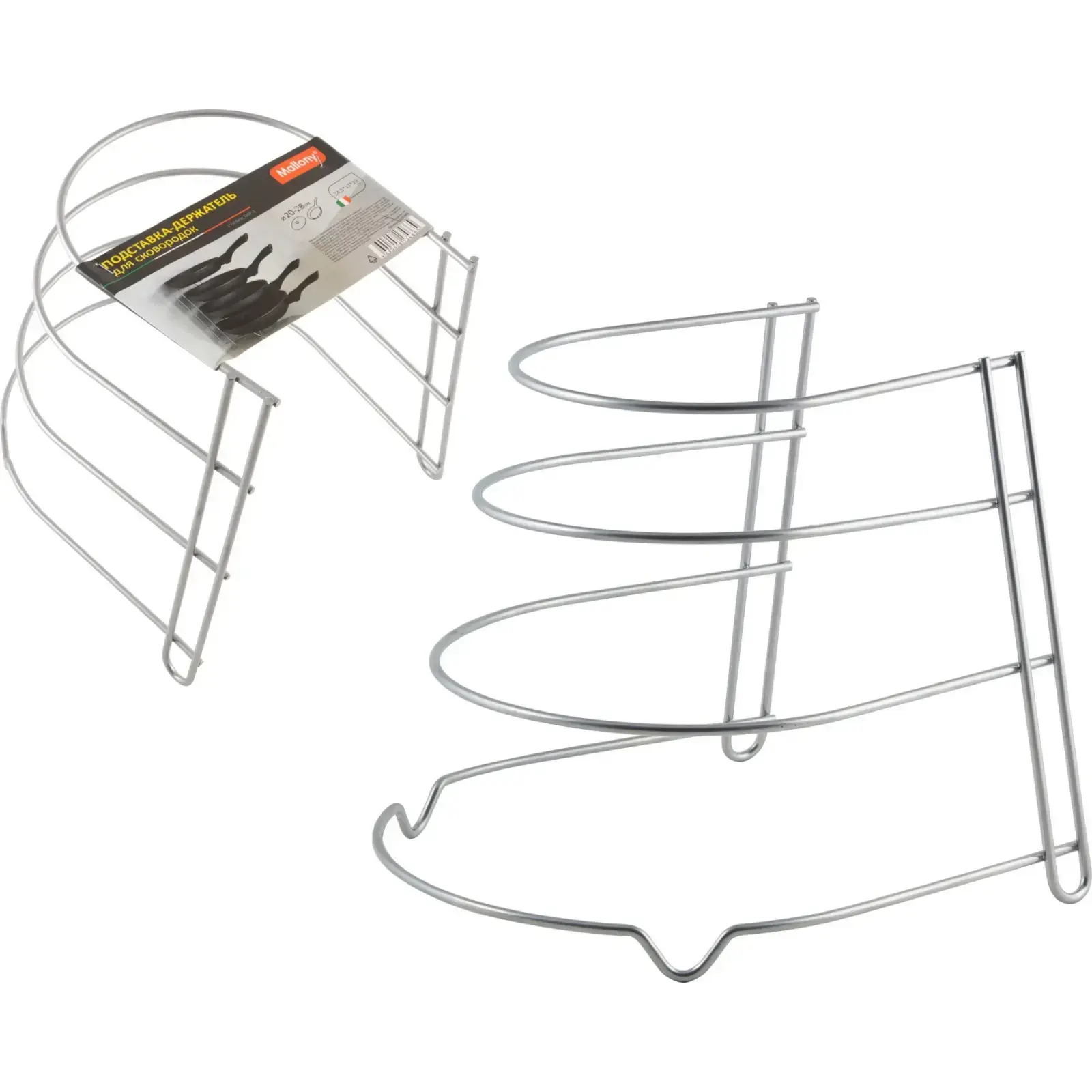 Подставка выполнена из гладкого металла с хромированным покрытием, что делает её не только прочной, но и лёгкой в уходе. Размеры подставки не указаны, но её конструкция позволяет разместить сковородки различных диаметров. Благодаря своей округлой форме и нескольким уровням, она идеально подходит для хранения сковородок, сохраняя их в идеальном состоянии.