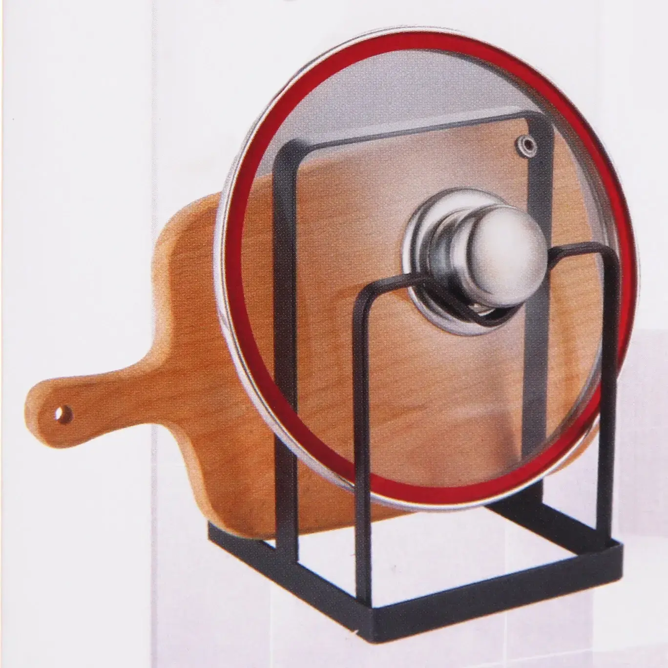 Конструкция с 4 вертикальными стойками и широким основанием гарантирует устойчивость даже при полной загрузке. Металлические элементы толщиной 2 мм рассчитаны на многолетнюю эксплуатацию без деформации. Особое расположение держателей позволяет одновременно хранить до 3 крышек и 2 разделочных досок.
