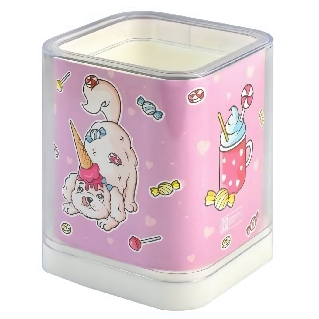 Подставка предназначена для хранения различных канцтоваров, таких как ручки, карандаши, маркеры и другие мелочи. Она подходит как для школьников, так и для офисных работников, которые ценят порядок и стиль. Яркий дизайн с изображением щенка и сладостей поднимет настроение и сделает процесс работы более приятным.