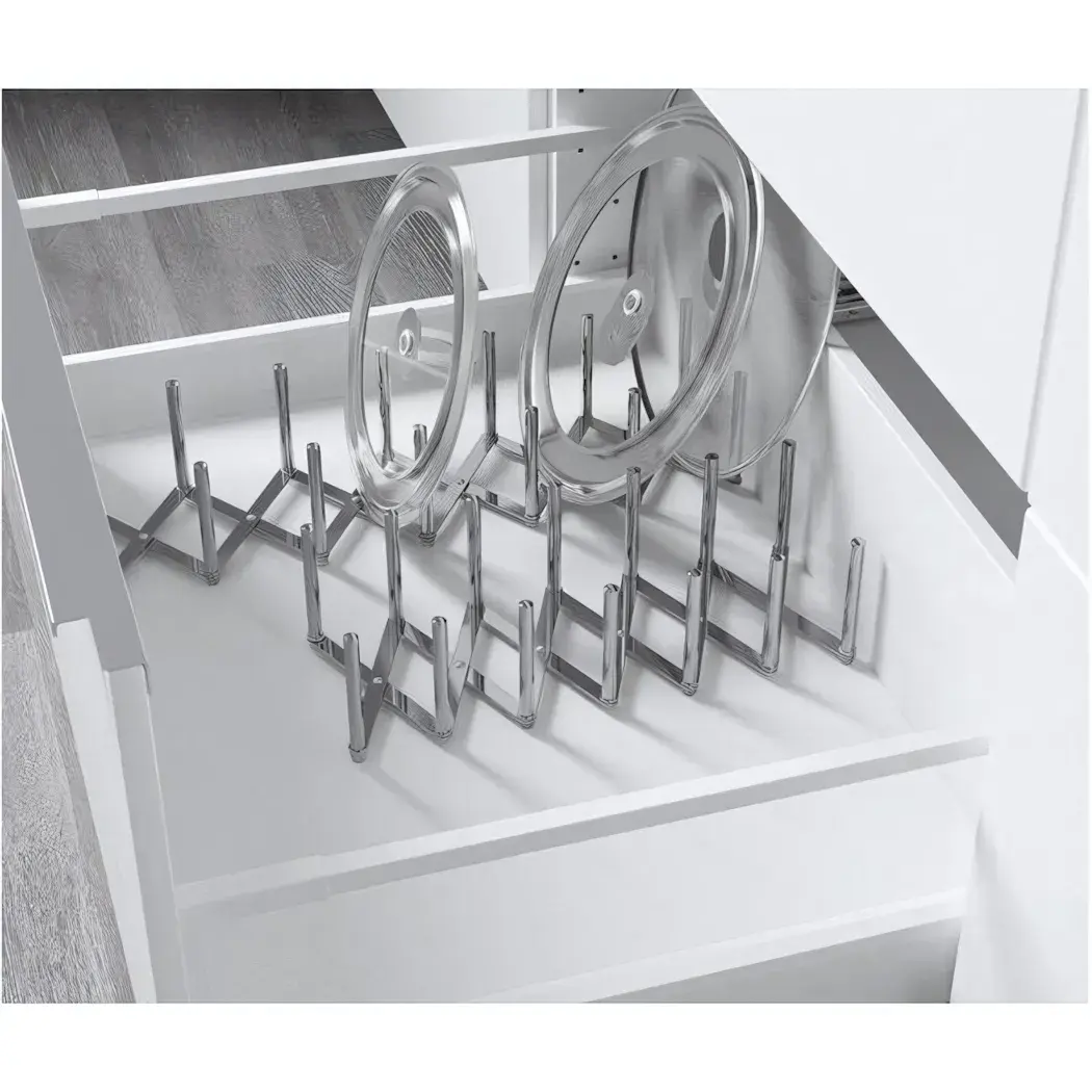 Эта подставка подходит для хранения крышек от кастрюль и сковородок различных размеров. Она легко устанавливается в кухонные шкафы или ящики, позволяя вам быстро находить нужные крышки. Металлическая конструкция обеспечивает долговечность и надежность, а серебристый цвет добавляет стильный акцент в интерьер вашей кухни.