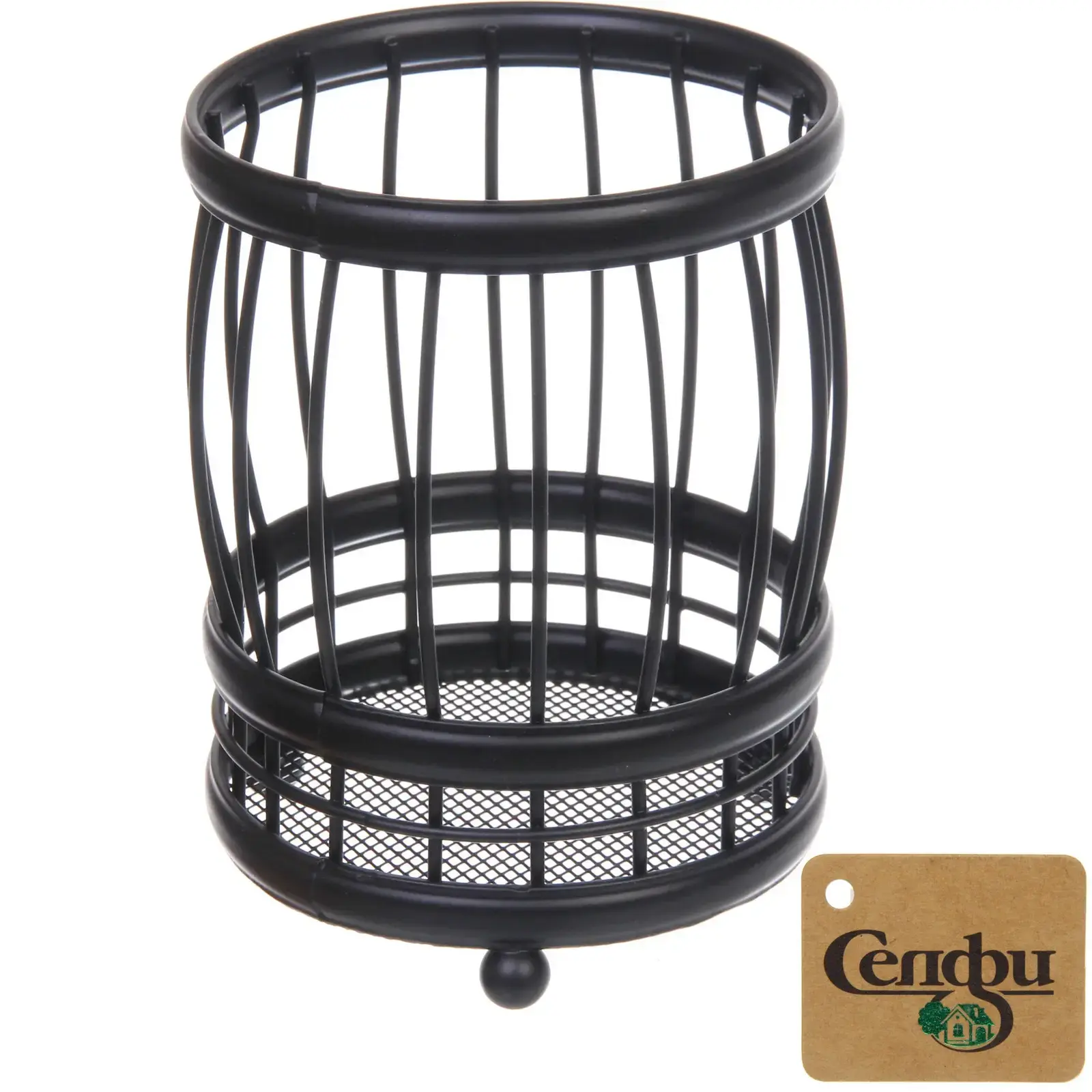 Подставка предназначена для хранения различных кухонных принадлежностей, таких как ложки, вилки, ножи и другие инструменты. Она может быть размещена как на столе, так и внутри кухонного гарнитура. Благодаря своей компактной форме (11х15 см) и стильному черному цвету, она легко впишется в любой интерьер.