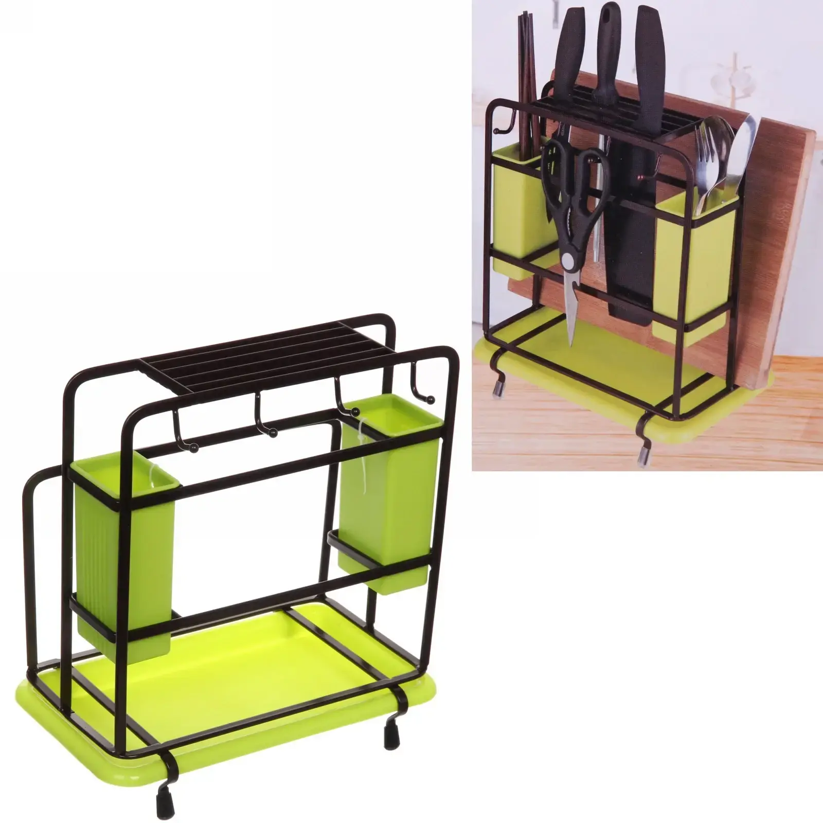 Металлическая конструкция с пластиковыми контейнерами создана для рационального хранения ножей, столовых приборов и кухонных мелочей. Эргономичный дизайн экономит пространство и обеспечивает мгременный доступ ко всему необходимому во время готовки.