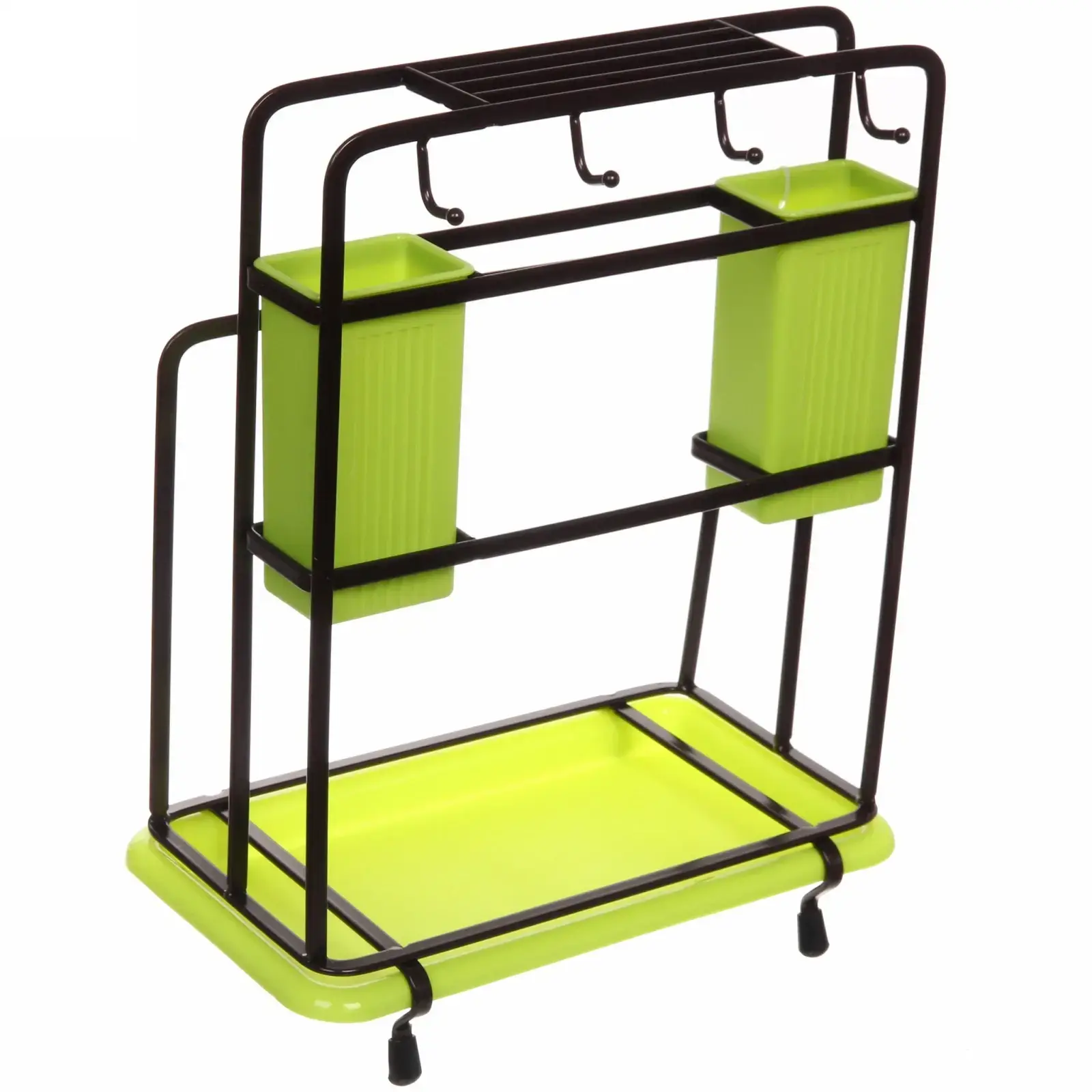 Установите на столешницу или внутри кухонного гарнитура. В контейнерах разместите часто используемые приборы, на крючки подвесьте аксессуары. Зелёный пластик устойчив к пятнам — просто протрите влажной салфеткой для ухода.