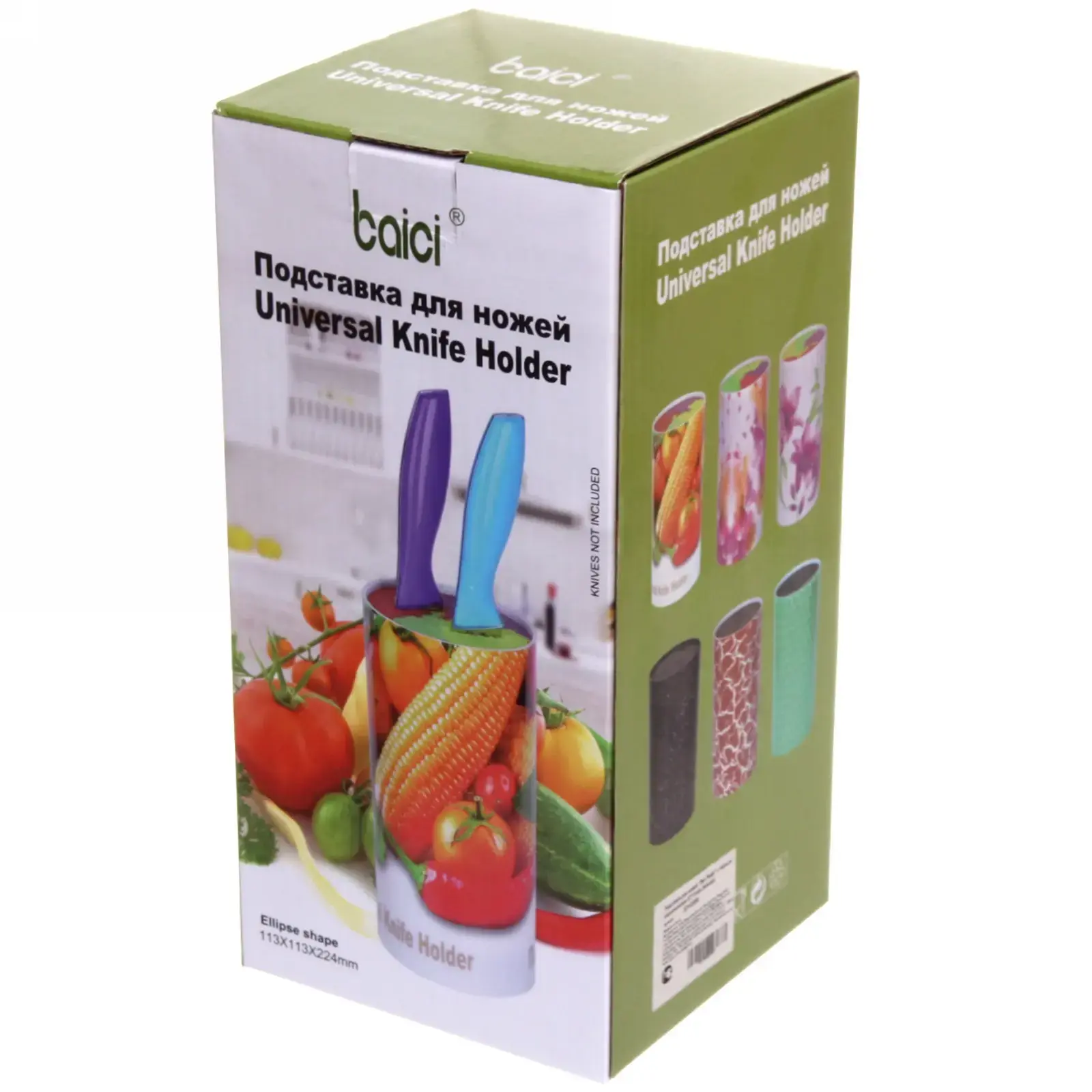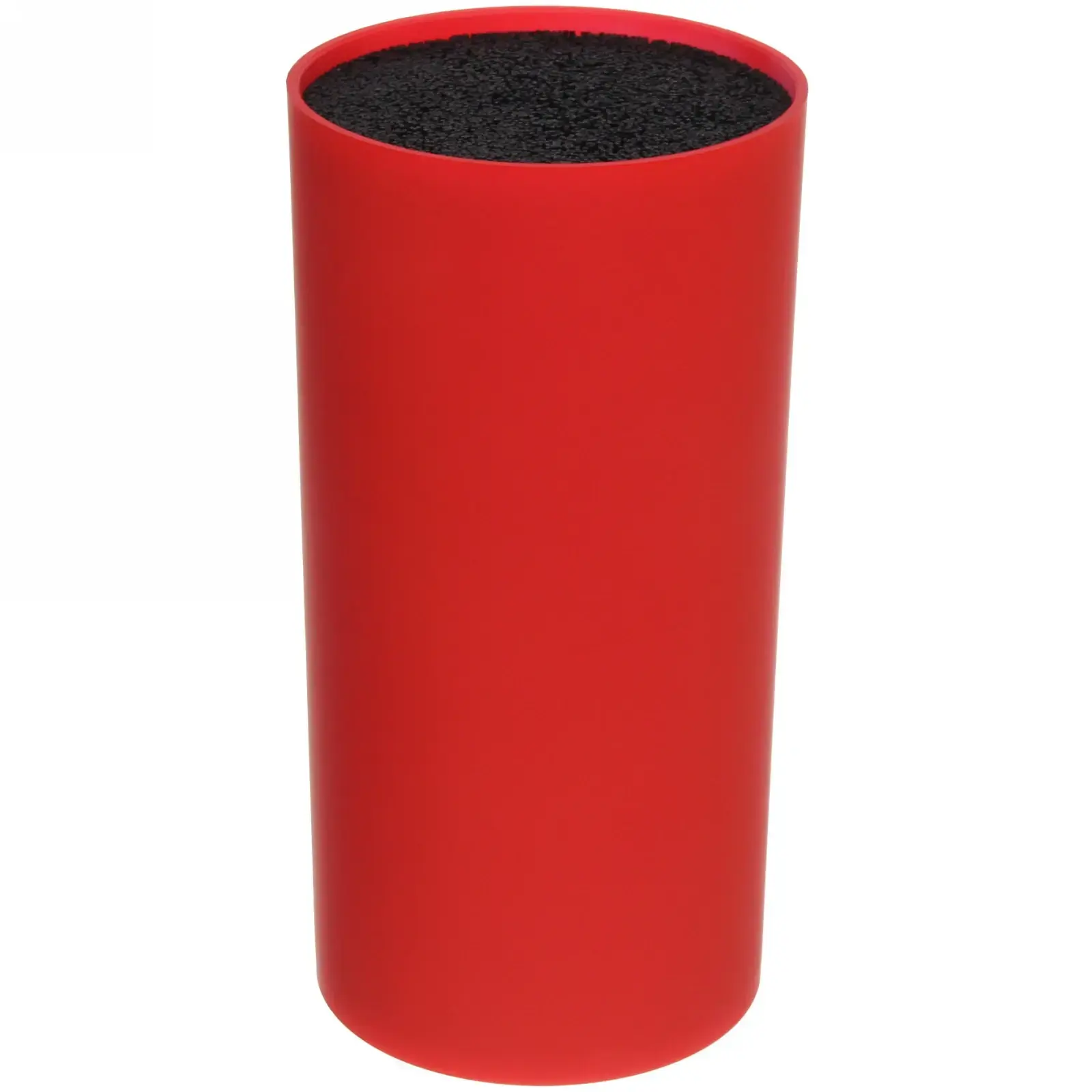 Подставка имеет цилиндрическую форму с гладкой матовой поверхностью и черным текстурированным верхом, что добавляет ей элегантности. Она выполнена из прочного пластика, что обеспечивает её долговечность. Размеры подставки составляют 22 см в высоту и 11 см в диаметре, что делает её удобной для хранения различных ножей. Обратите внимание, что ножи в комплект не входят.