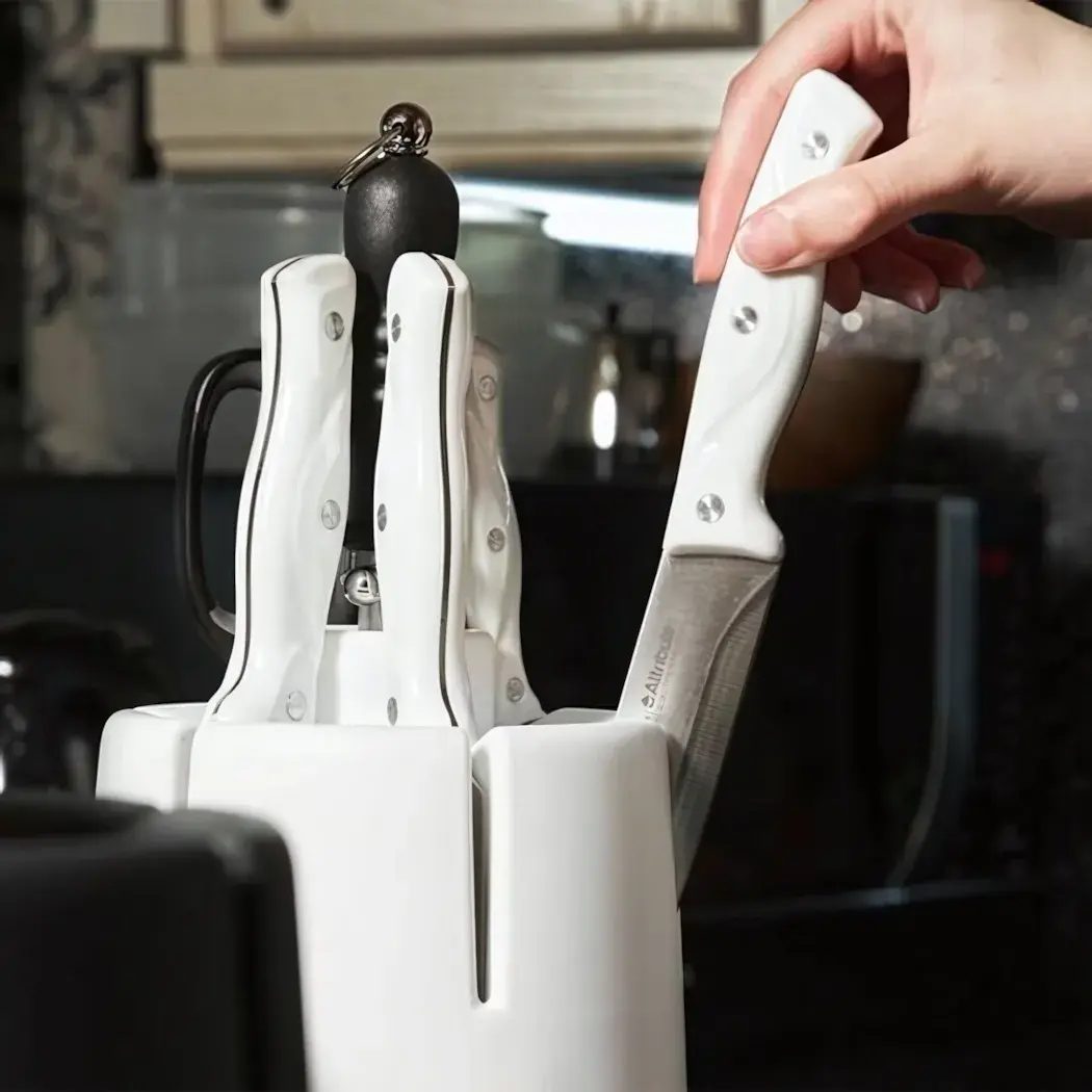 Универсальная подставка с перфорированным основанием сохранит остроту лезвий и организует рабочее пространство. Стильный белый дизайн гармонично впишется в любой интерьер, а продуманная конструкция обеспечит долговечность использования.