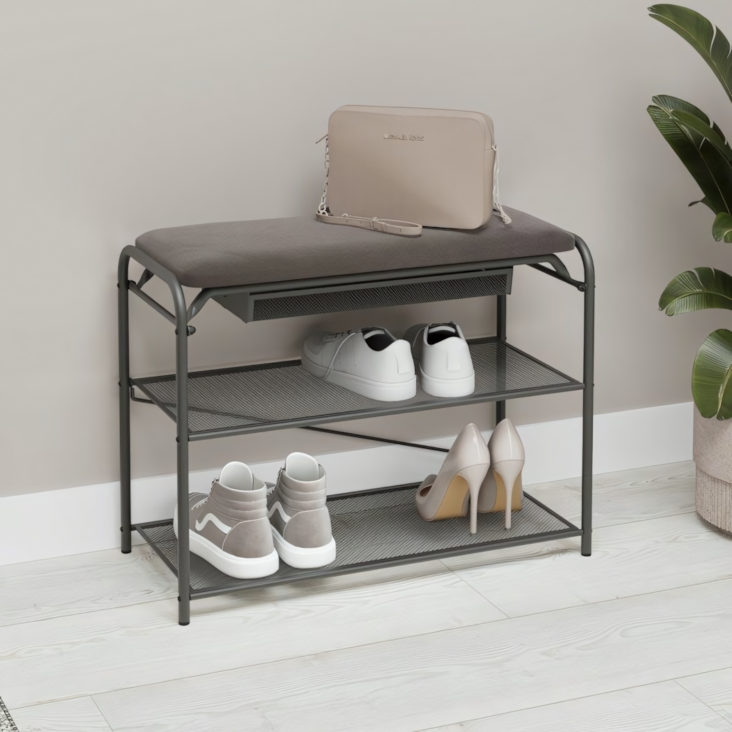 Каркас выполнен из прочного металла. Стальные элементы покрыты полимерным слоем, который защищает поверхность от коррозии и механических повреждений. Скамья выдерживает нагрузку до 120 кг, обеспечивая устойчивость и безопасность при ежедневном использовании. Полки из металлической сетки способствуют циркуляции воздуха, что помогает обуви быстрее просыхать.