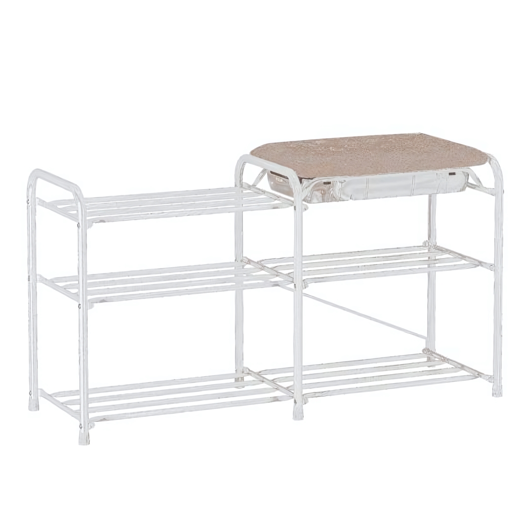 - Металлический каркас с решётчатыми полками — циркуляция воздуха помогает обуви быстрее просыхать.