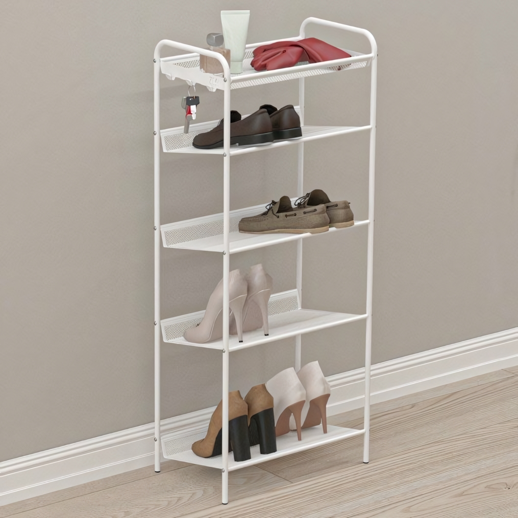 Пять полок позволяют рационально распределить пары обуви, а оптимальное расстояние между уровнями подходит как для легких туфель, так и для более объемной зимней обуви. Наклонные полки и специальные бортики защищают стены от загрязнений. Верхняя корзина удобна для хранения перчаток, средств по уходу за обувью и других мелочей, которые всегда должны быть под рукой. Боковые крючки подойдут для ключей или ложки для обуви.