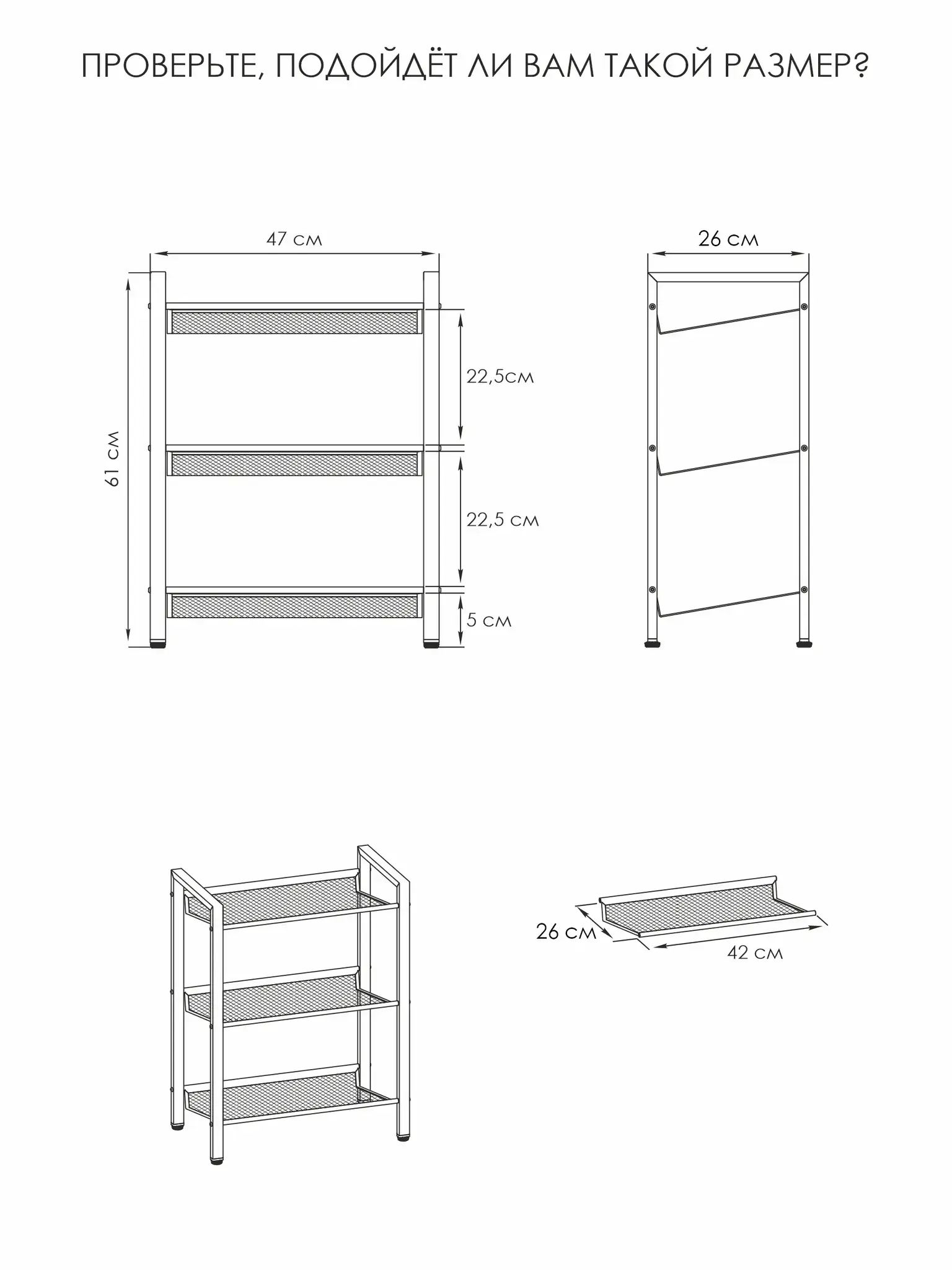 - Высота между полками: 22.5 см (2 нижние), 5 см (верхняя)