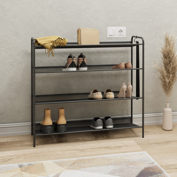 Подставка имеет четыре уровня, что позволяет разместить на ней различные пары обуви, от высоких ботинок до легких туфель. Она идеально подходит для хранения обуви всей семьи, а также для организации пространства в прихожей или гардеробной. Легкая и прочная конструкция позволяет легко перемещать подставку в любое место.