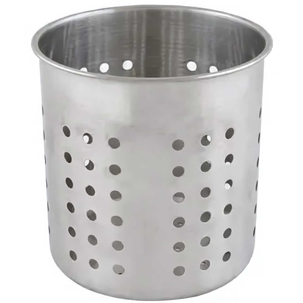 Цилиндрический контейнер высотой 13.5 см оптимален для хранения стандартных кухонных принадлежностей. Перфорированные стенки обеспечивают постоянный воздухообмен, а зеркальная полировка поверхности добавляет эстетики в интерьер.