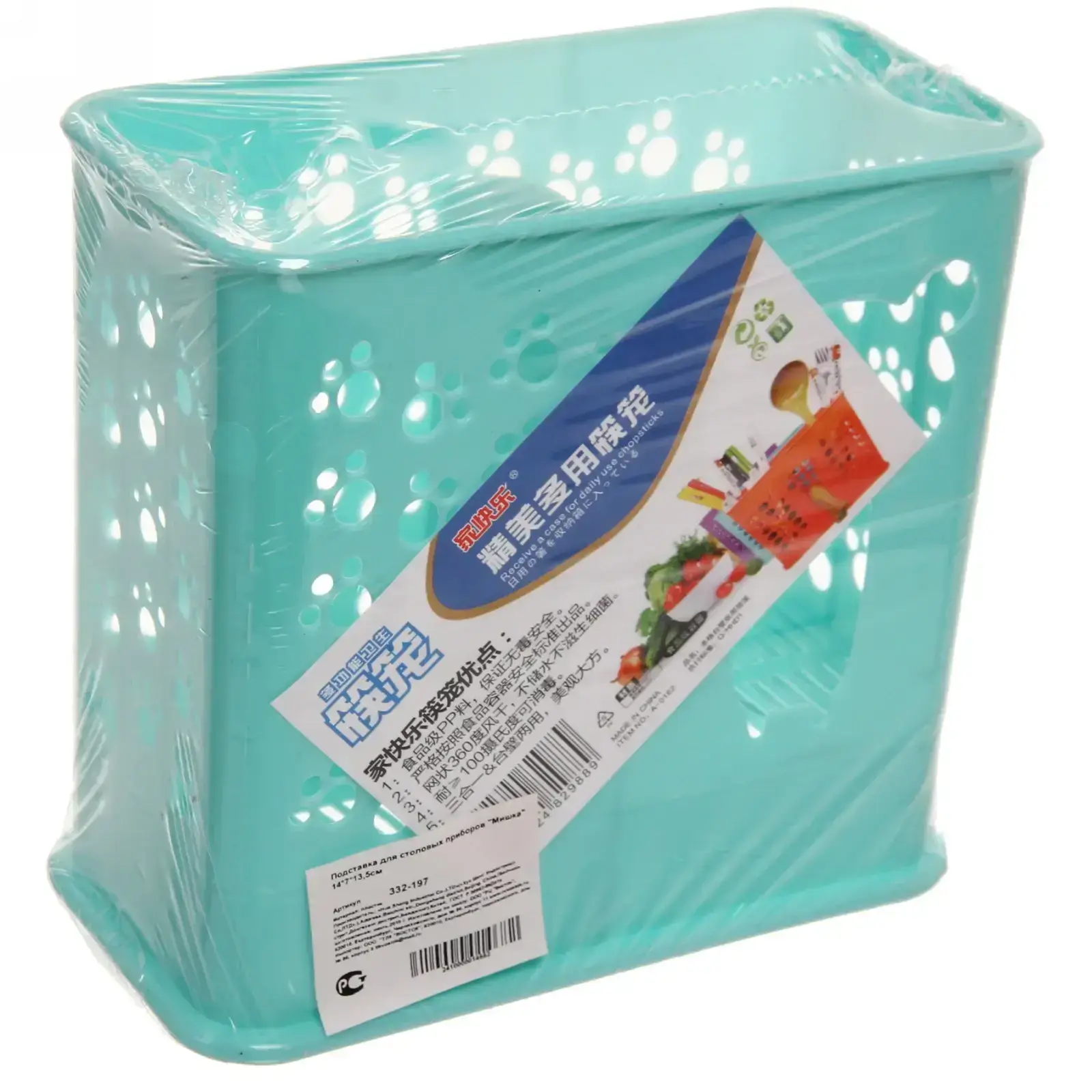 Подставка идеально подходит для хранения ложек, вилок и ножей, а также мелких кухонных принадлежностей, которые всегда должны быть под рукой. Её размеры 14х7х13,5 см делают её компактной и удобной для использования на любом столе или кухонной поверхности.