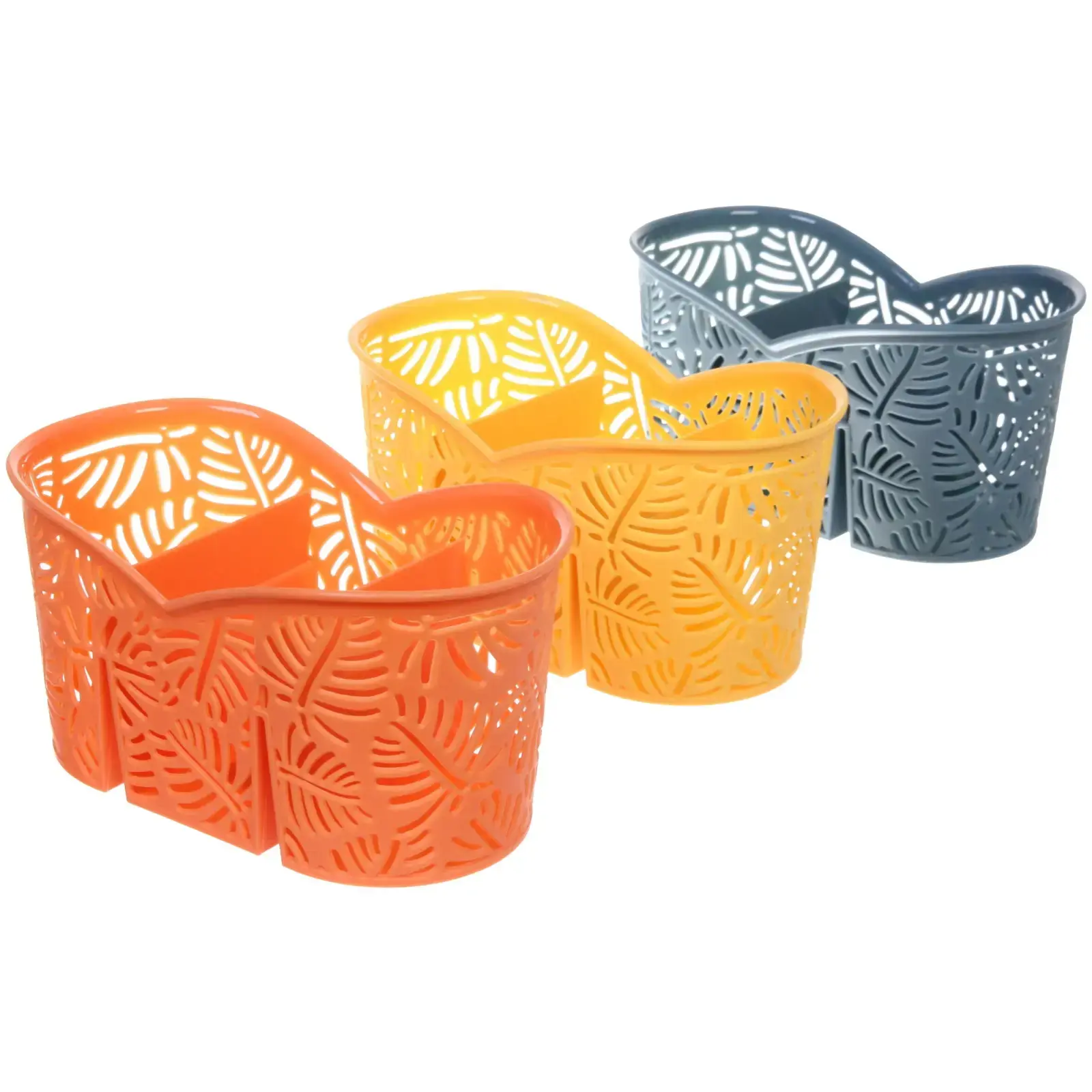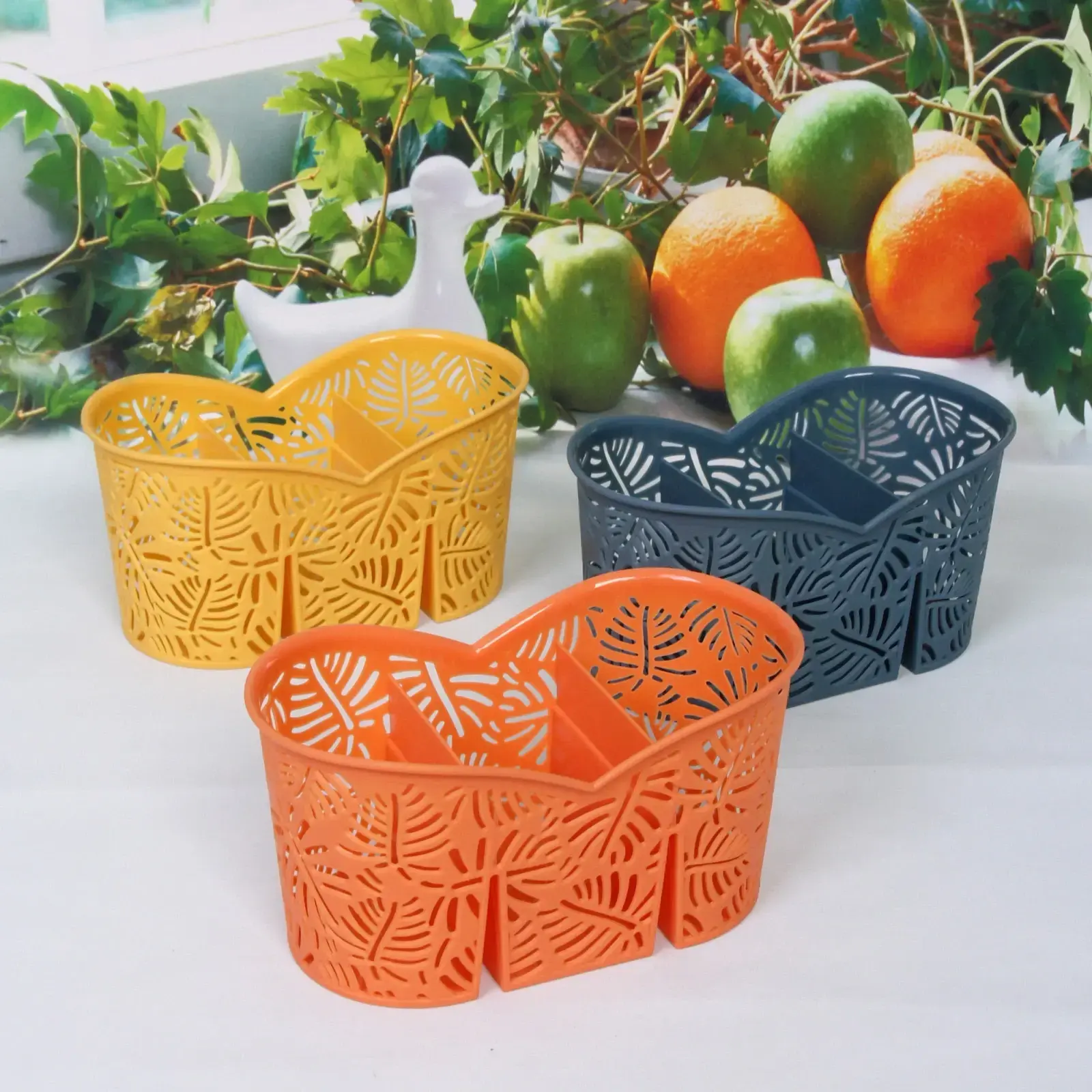 Подставка «Папоротник» имеет три секции, что позволяет удобно разделить пространство для различных приборов. Изготовленная из прочного и легкого пластика, она легко очищается и не требует особого ухода. Эстетичный внешний вид с узором в виде листьев добавляет изюминку в ваш кухонный интерьер.