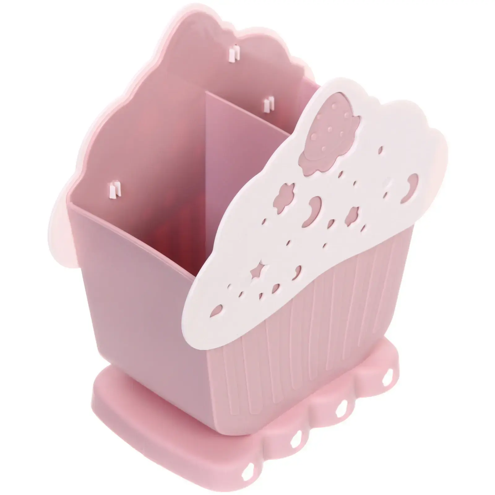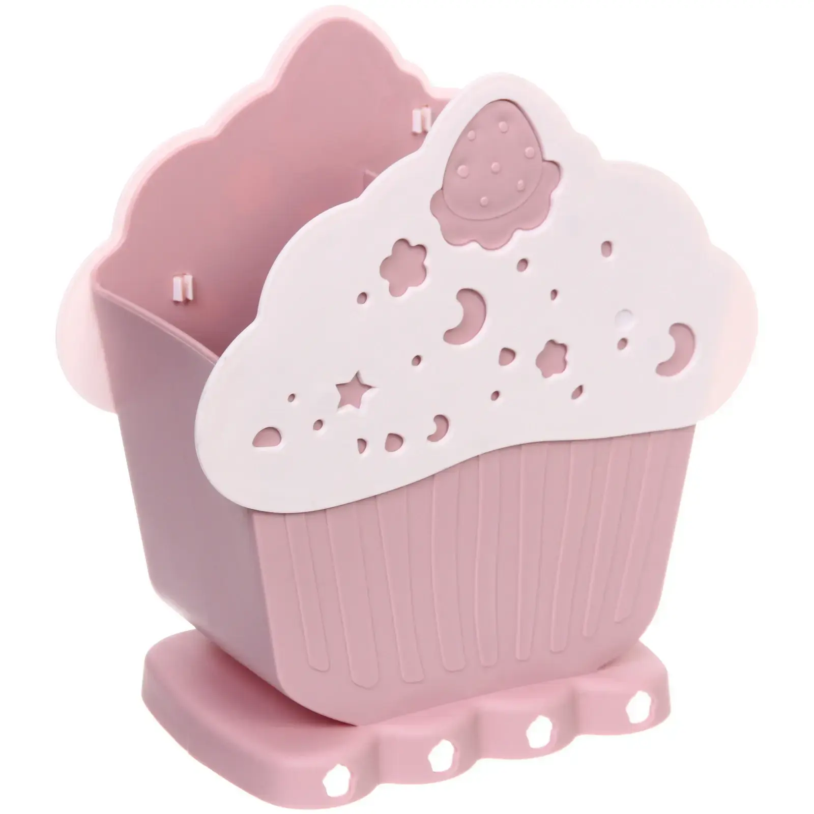 Подставка выполнена из качественного пластика, что гарантирует её долговечность и легкость в уходе. Гладкая внутренняя поверхность облегчает процесс очистки, а стильный дизайн в форме кекса с рифлёной нижней частью добавляет оригинальности. Выемки в верхней части подставки не только украшают, но и делают её более функциональной.