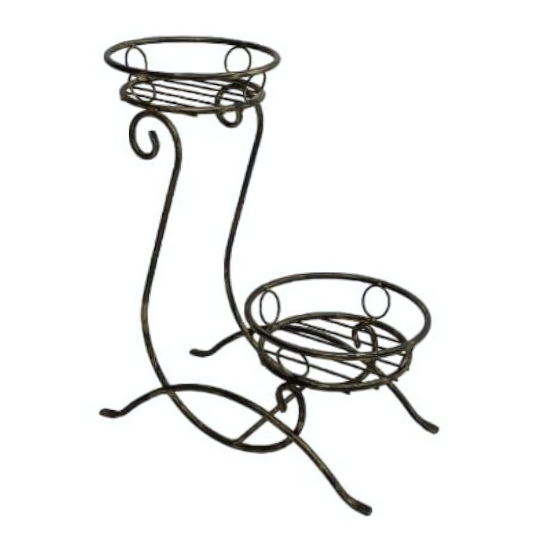 Модель рассчитана на 2 горшка с посадочным размером до 23 см. Корзины расположены на разных уровнях, что позволяет создать выразительную цветочную композицию. Устойчивая основа с изогнутыми ножками надежно фиксирует подставку на полу, а компактная вертикальная конструкция экономит место.