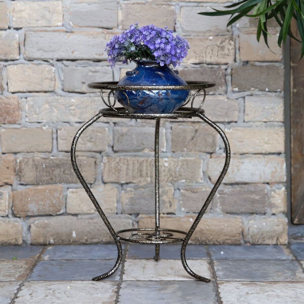 Подставка гармонично сочетается с керамическими и пластиковыми горшками, а благородный оттенок с лёгким эффектом патины подчёркивает зелень растений и цветущие композиции. Это практичный способ добавить интерьеру выразительности и аккуратно организовать пространство вокруг любимых цветов.