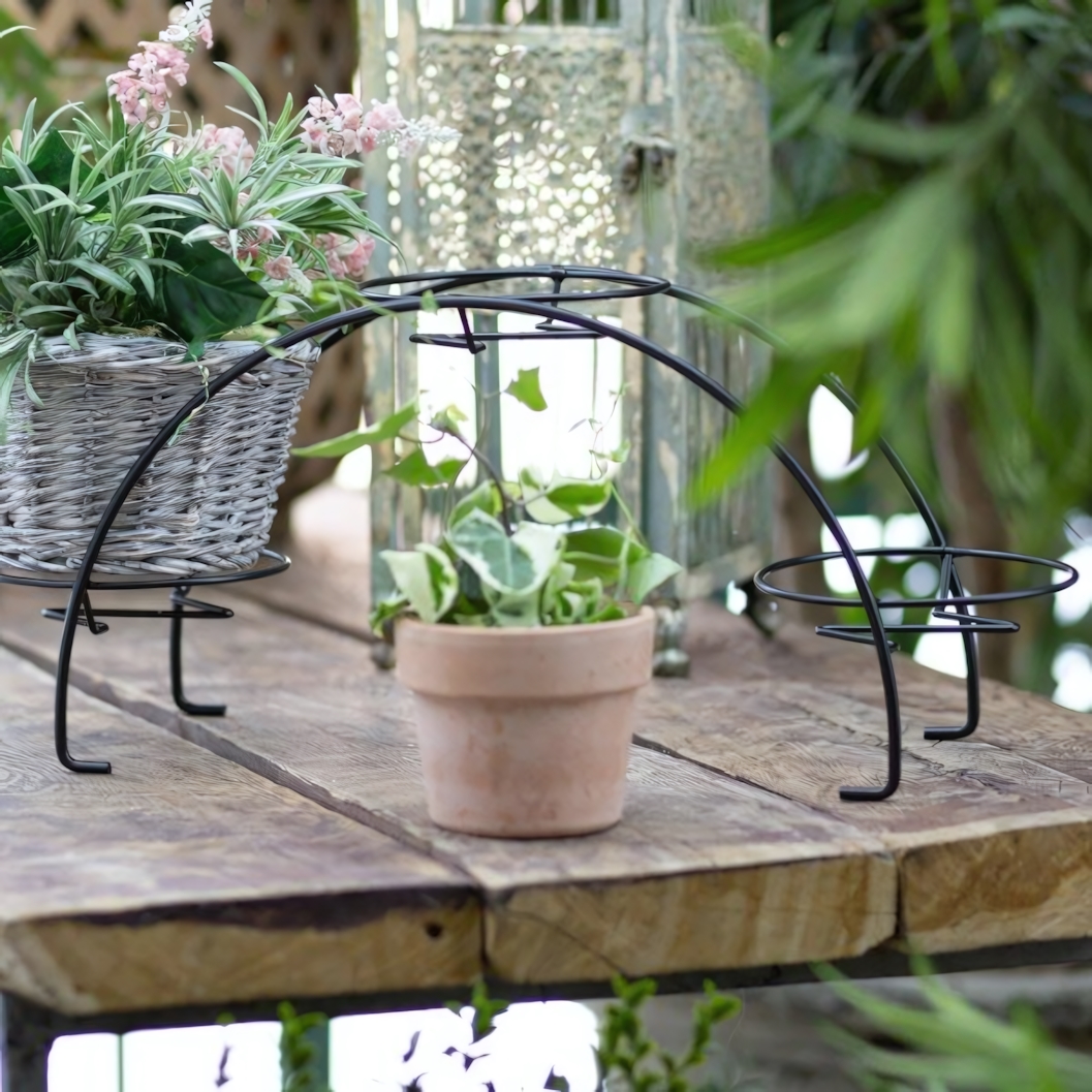 Металлическая конструкция отличается прочностью и устойчивостью. Четыре изогнутые ножки обеспечивают надежную опору на полу, а круглые держатели с дополнительными перемычками фиксируют горшок и помогают сохранить устойчивость. Черный цвет универсален и гармонично сочетается с любыми кашпо и стилями интерьера — от минимализма до классики.